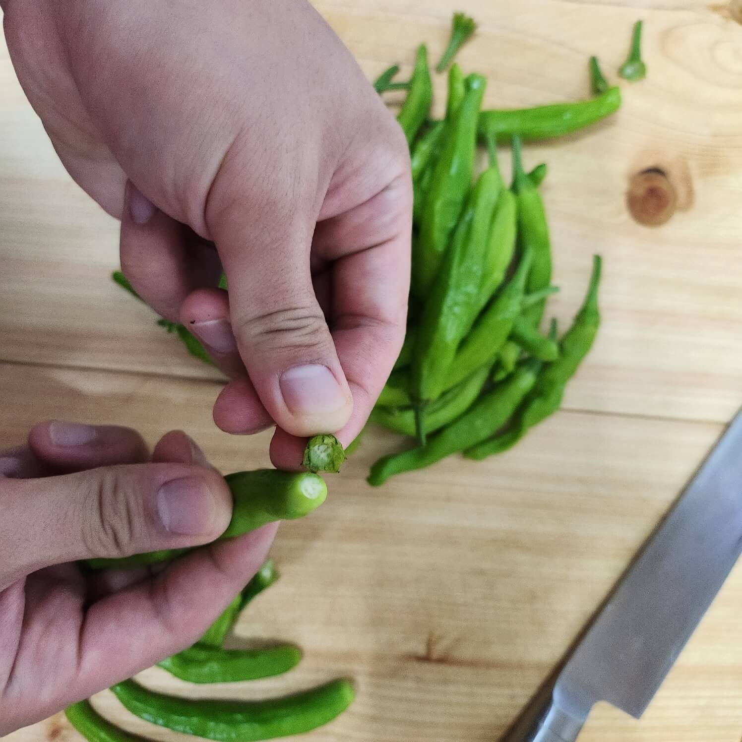 1. 꽈리고추는 꼭지를 따고, 물에 1번 씻어준 뒤에 포크로 끝 부분을 콕 찍어서 구멍을 내주면 된다.
