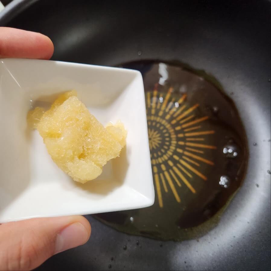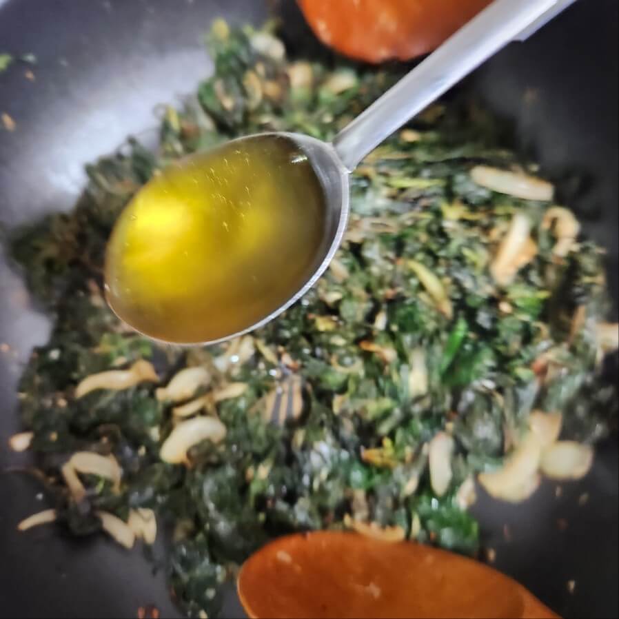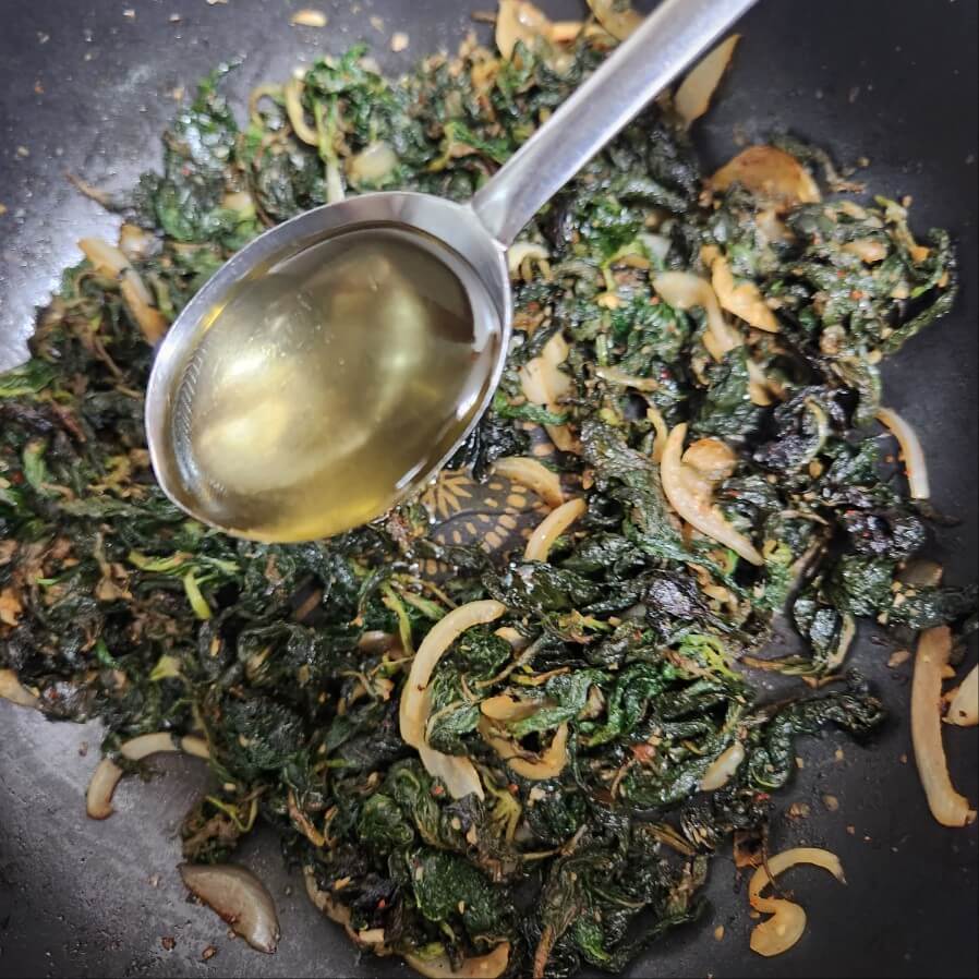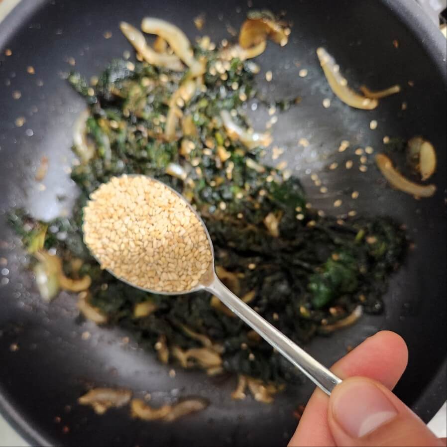 5. 5분뒤에 숟가락 기준으로 들기름 1, 올리고당 1, 통깨 1을 넣고 마무리로 1분간 쎄게, 빠르게 볶아주면 된다.