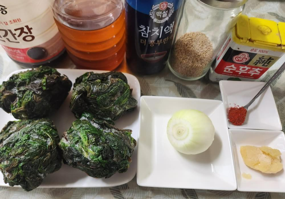 - 냉동 깻잎 356g, 양파 1개, 다진마늘, 고춧가루, 진간장, 들기름, 참치액젓, 통깨, 후추