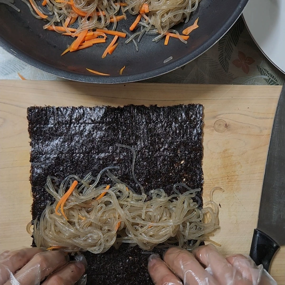 5. 김은 거친면에 당면을 올려놓고 돌돌 말아주면 된다.