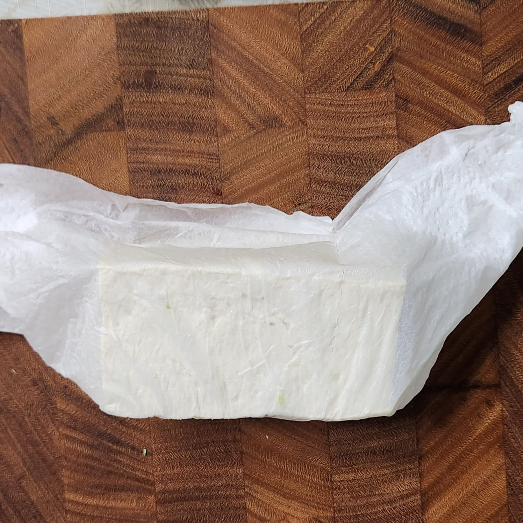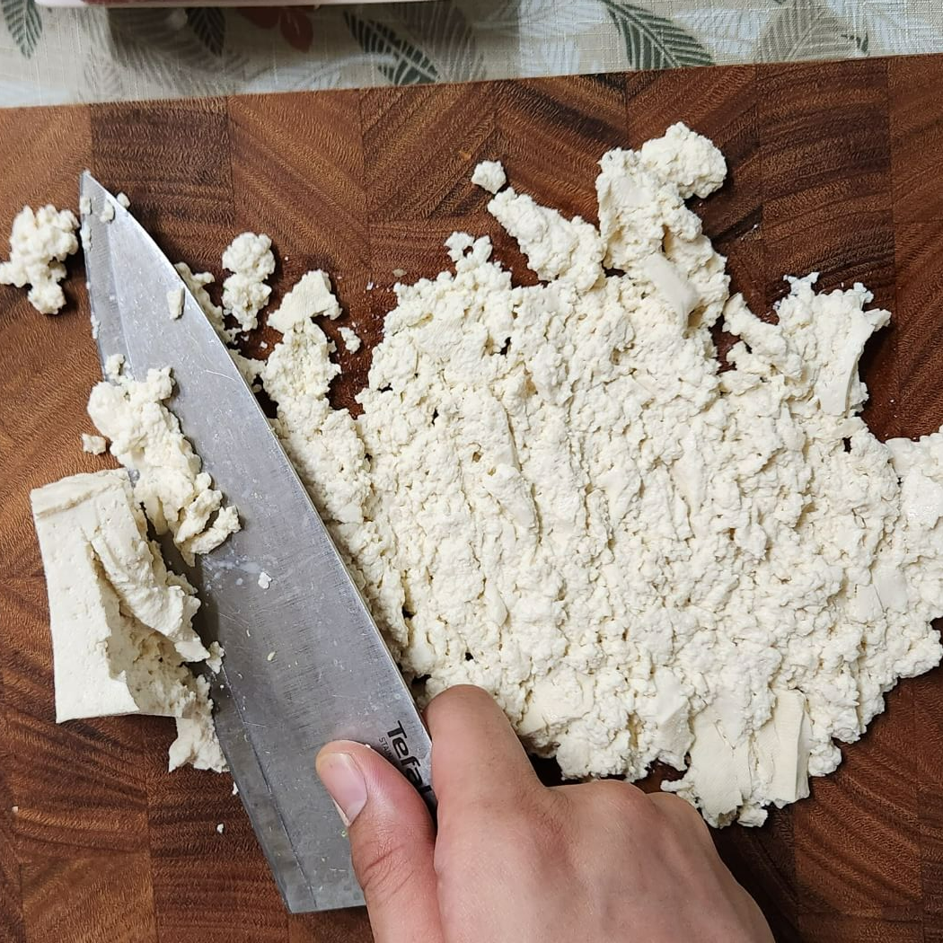 2. 두부 반모에는 수분이 많기 때문에 키친타올로 물기를 제거 한 뒤에 칼 등으로 눌러서 두부를 모두 으깨주면 된다.