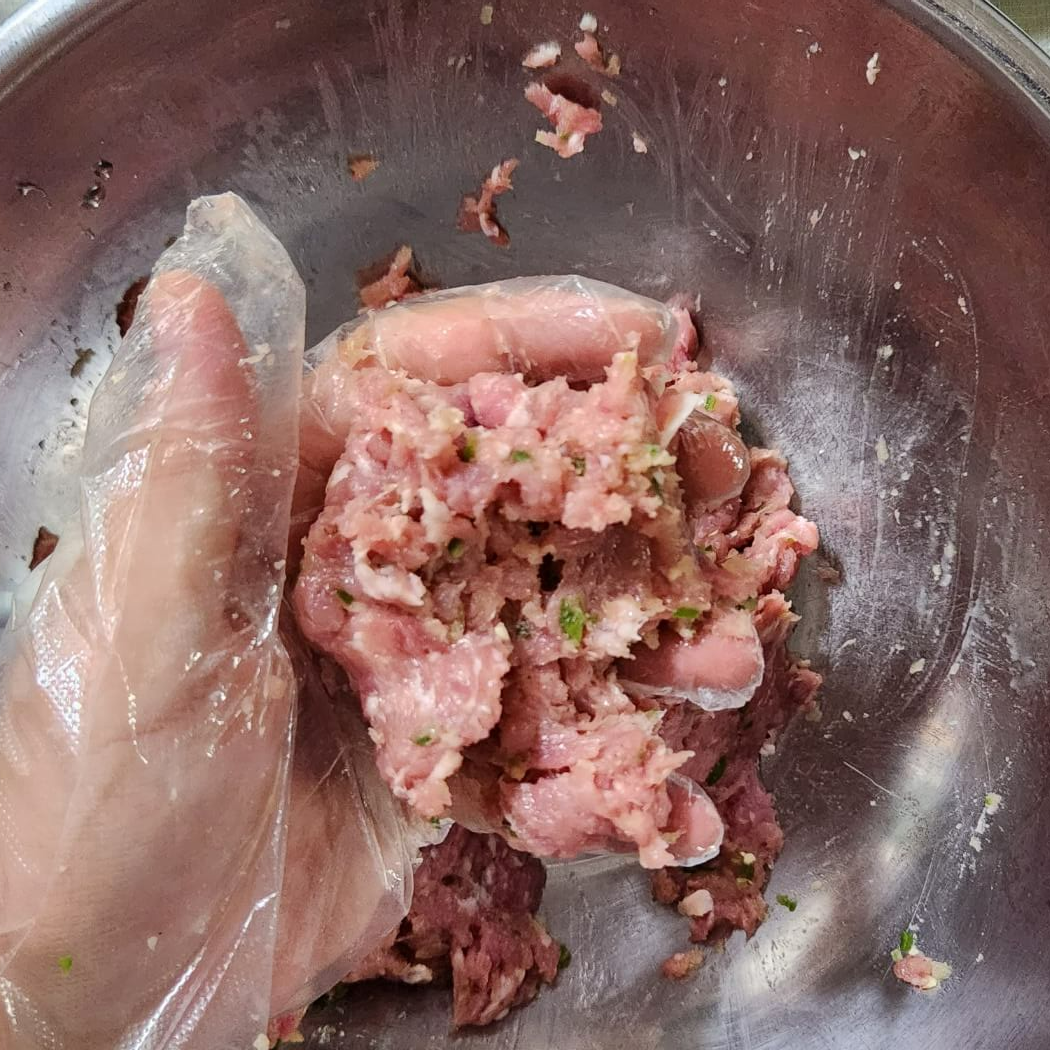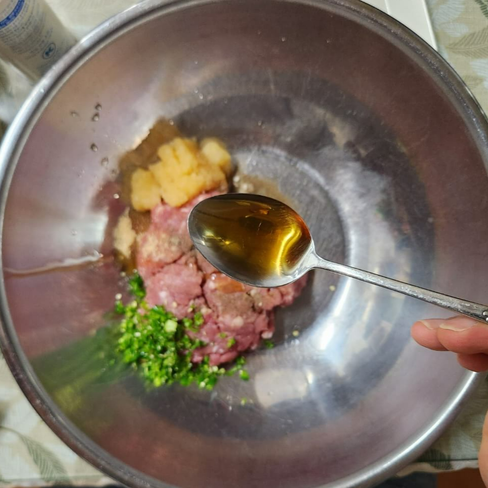 4. 이제 다짐육, 청양고추, 다진마늘, 후추 5번 털어준 다음 숟가락기준으로 미림 1, 티스푼 기준으로 소금 2를 넣고 치데주면 된다.