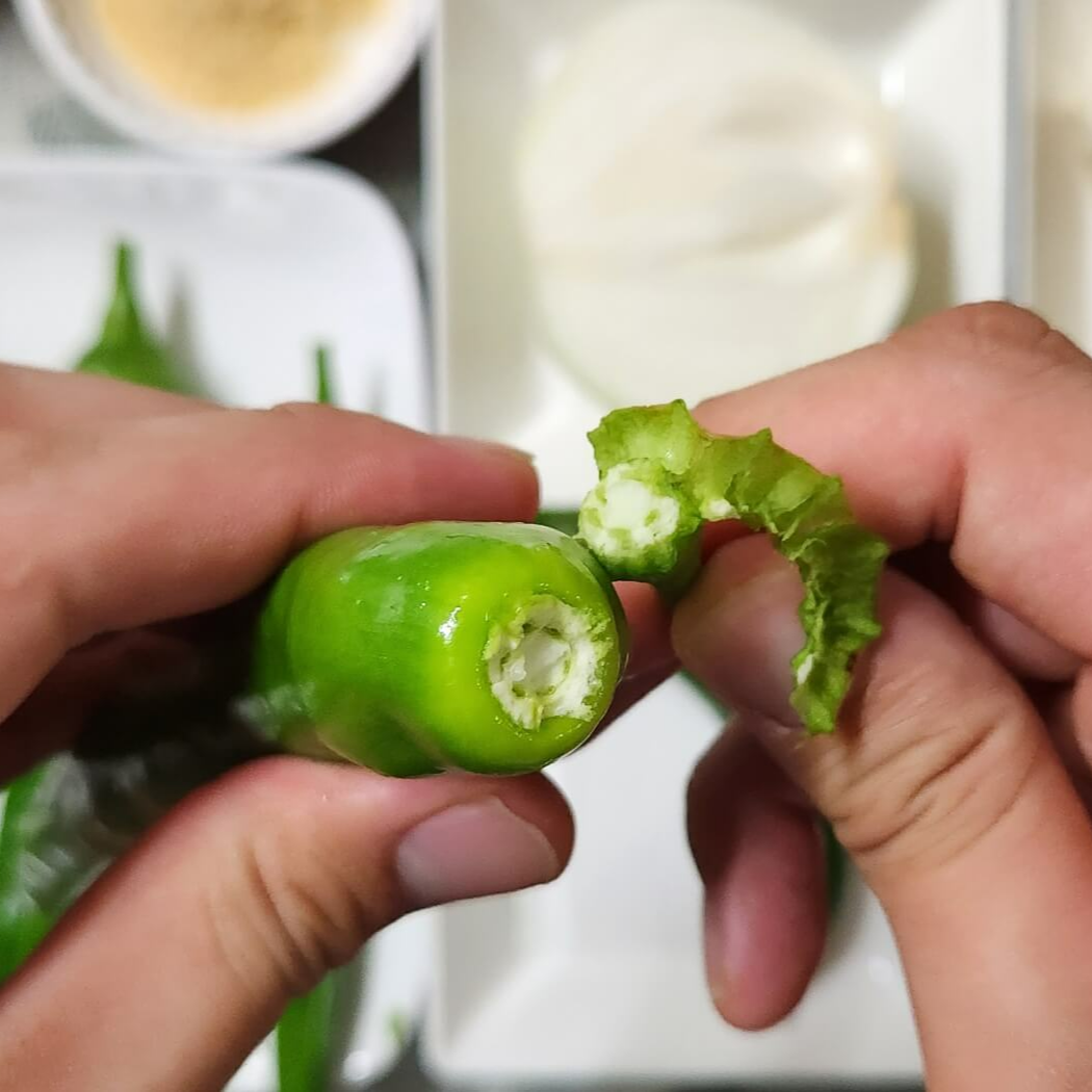 1. 고추는 꼭지를 떼고, 반으로 가른다음에 숟가락을 이용해서 고추씨를 모두 빼주면 된다.