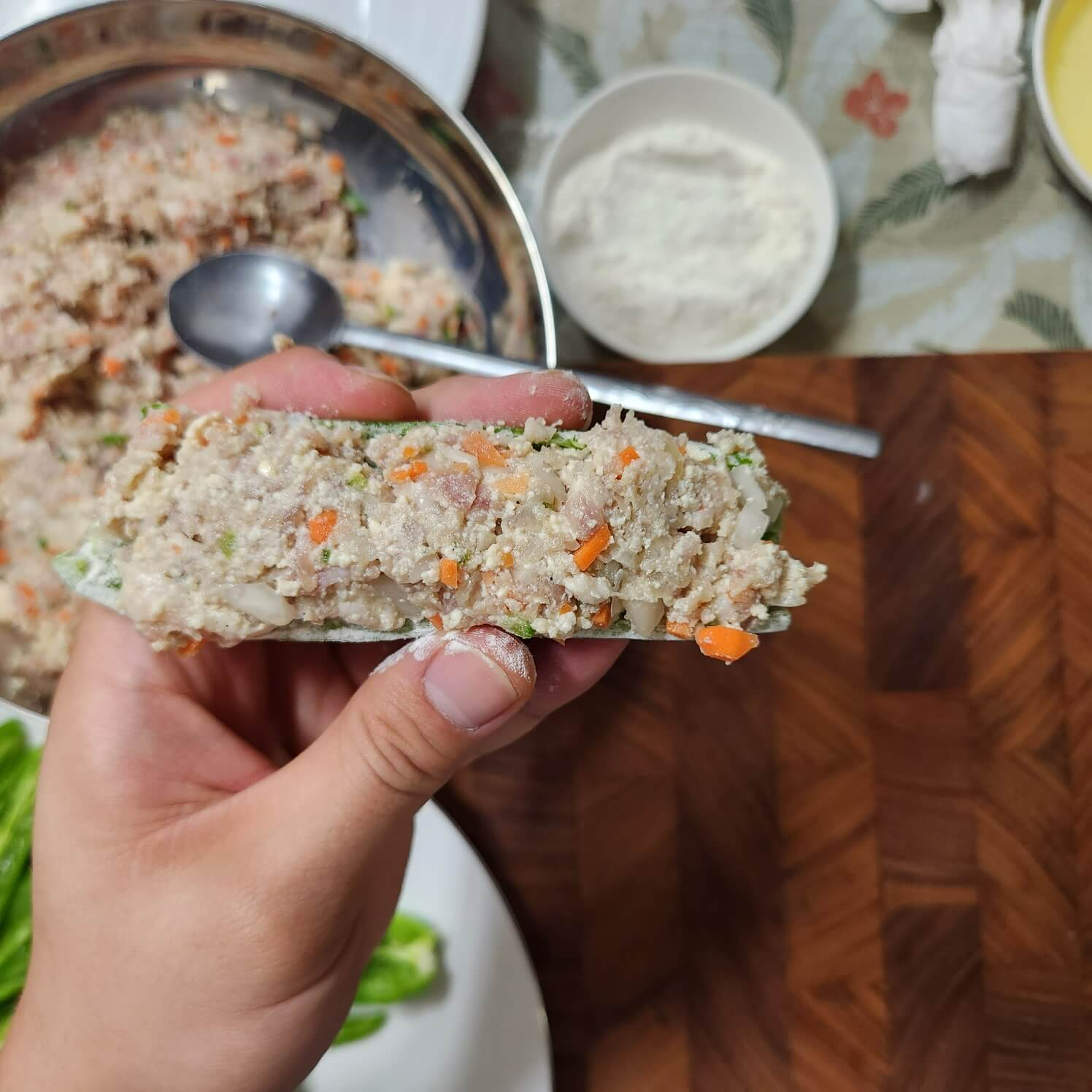 - 양파 반개, 두부 반모, 아삭이 고추 1팩, 청양고추 1개, 당근 조금, 다진마늘 44g, 다짐육, 설탕, 튀김가루, 후추, 미림, 참기름, 구운소금