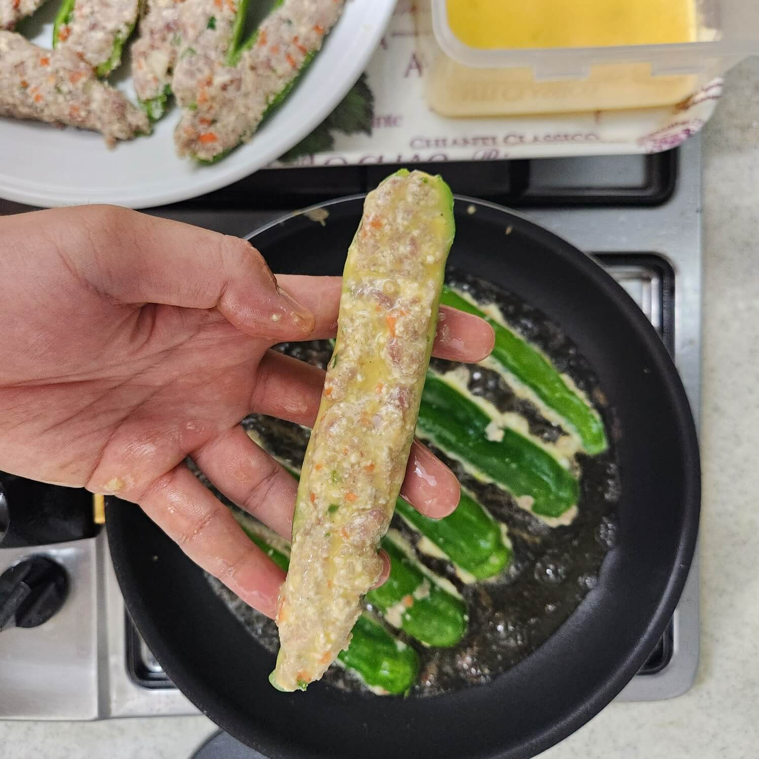 ✅이때 기름은 넉넉히 부어주고, 고추와 다짐육이 단단히 붙도록 밀가루를 발라주면 좋다.