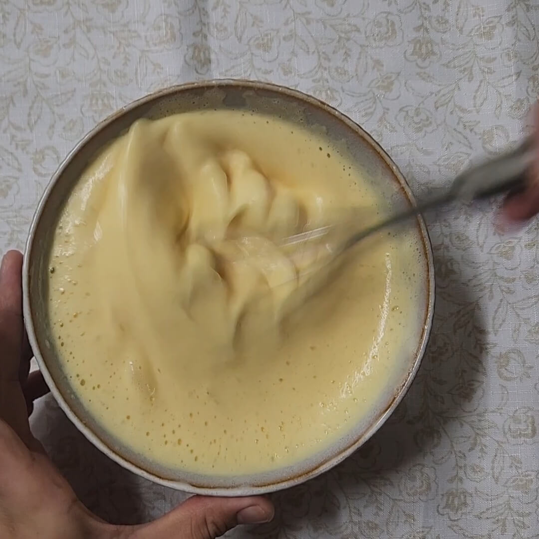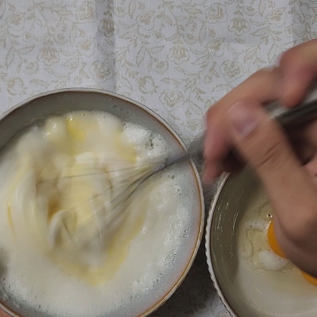📌오른쪽 처럼 흰색 거품이 솜사탕 처럼 올라오면 그 다음에는 노른자를 넣고 저어 주면 된다.