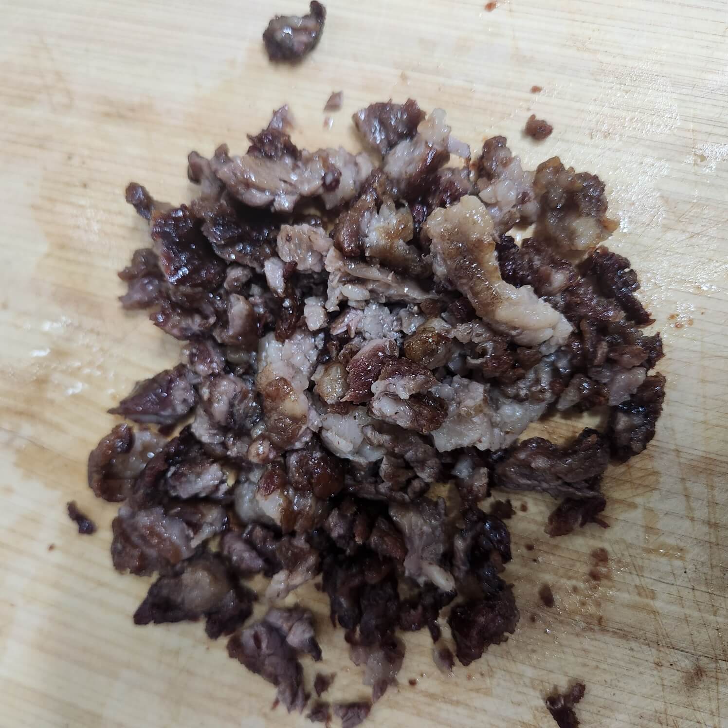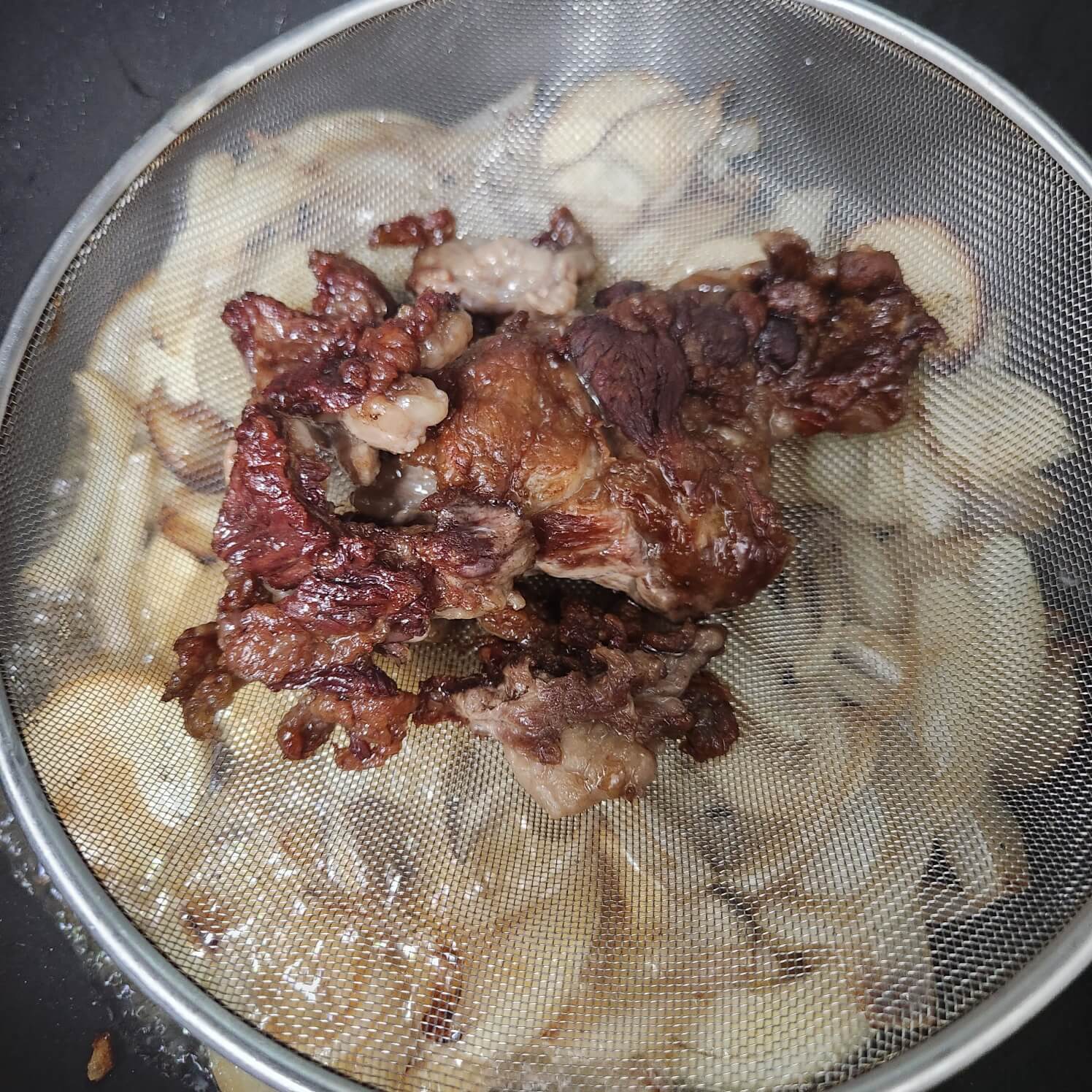 4. 팬에서 소고기 기름을 만든 것을 채반에 바쳐서 양파와 새송이 버섯을 볶아주고, 튀긴 소고기를 얇게 다져주면 된다.