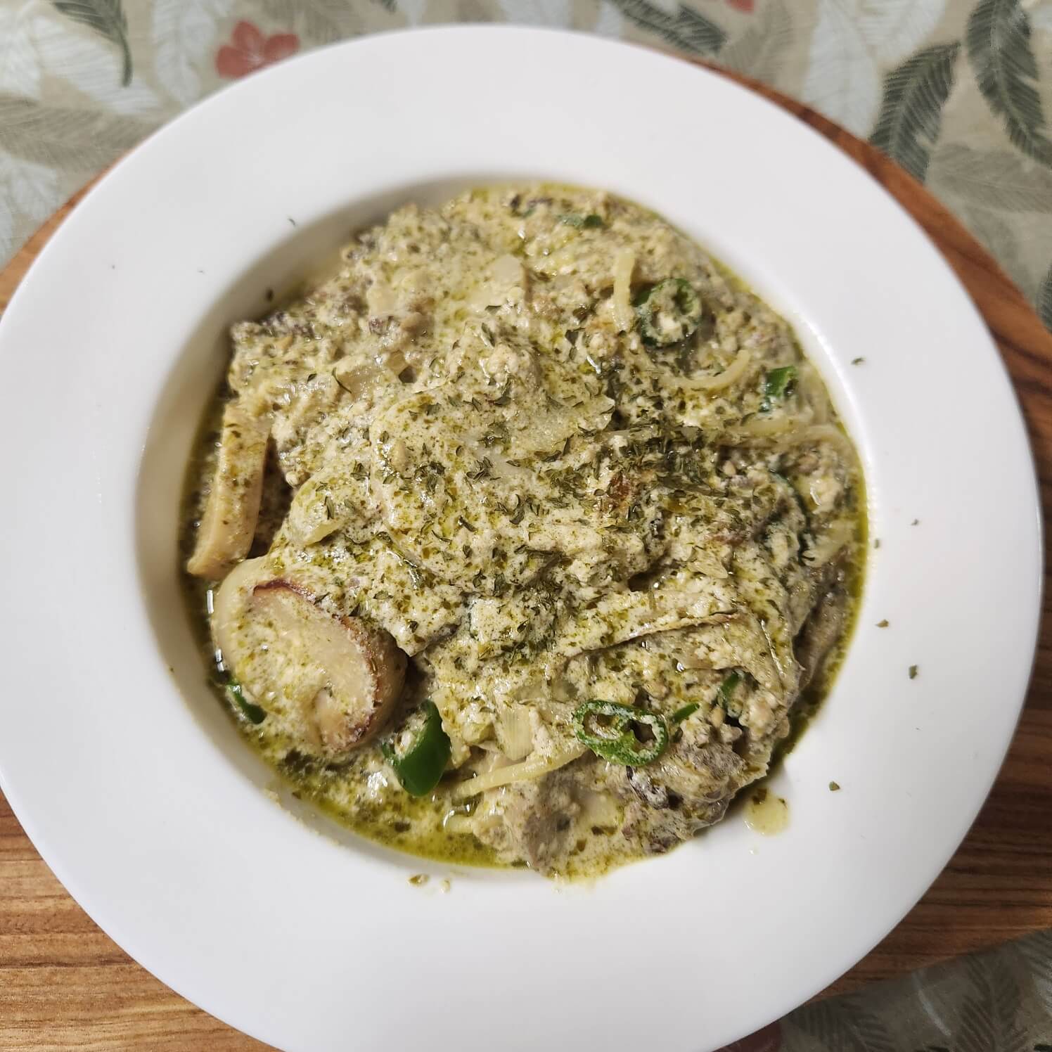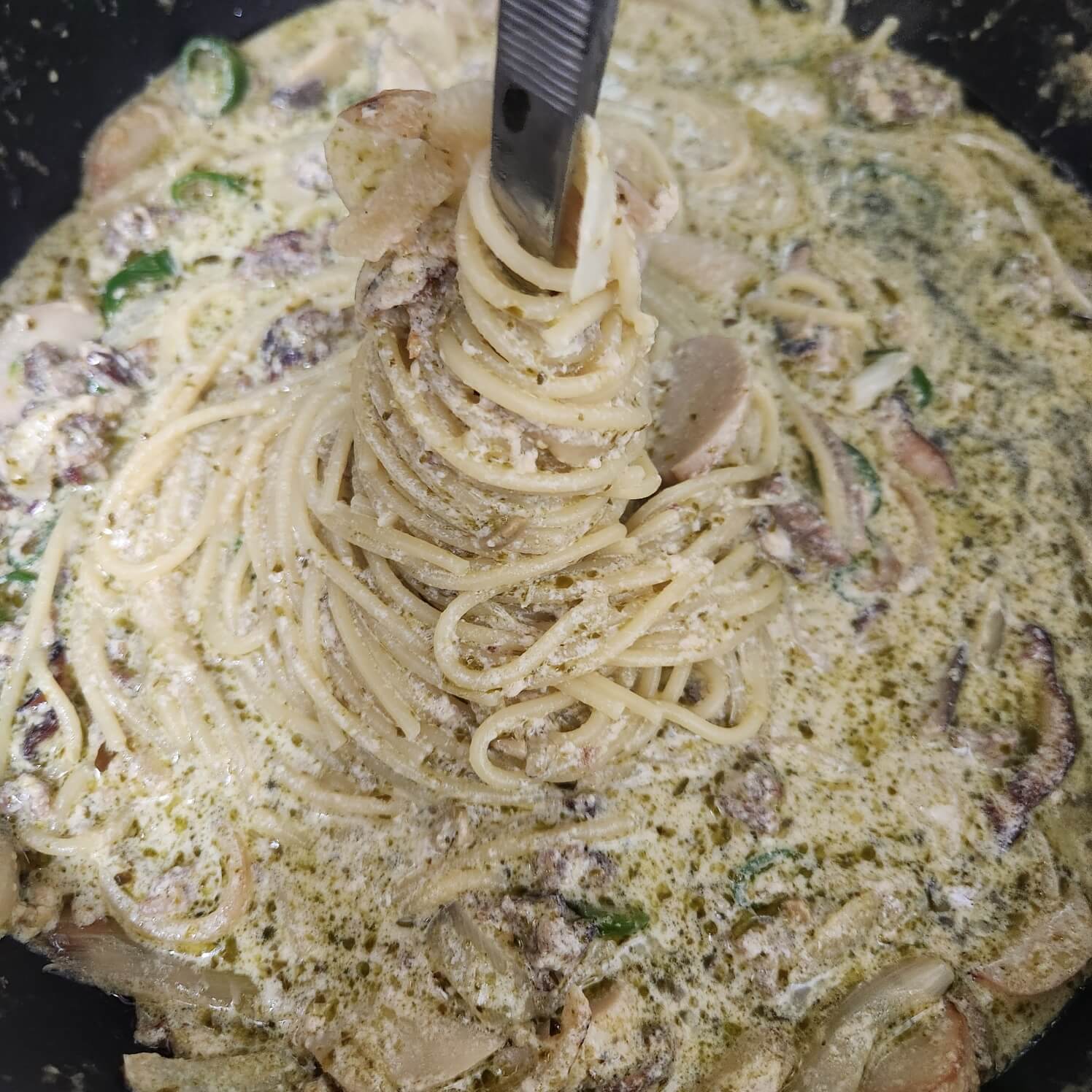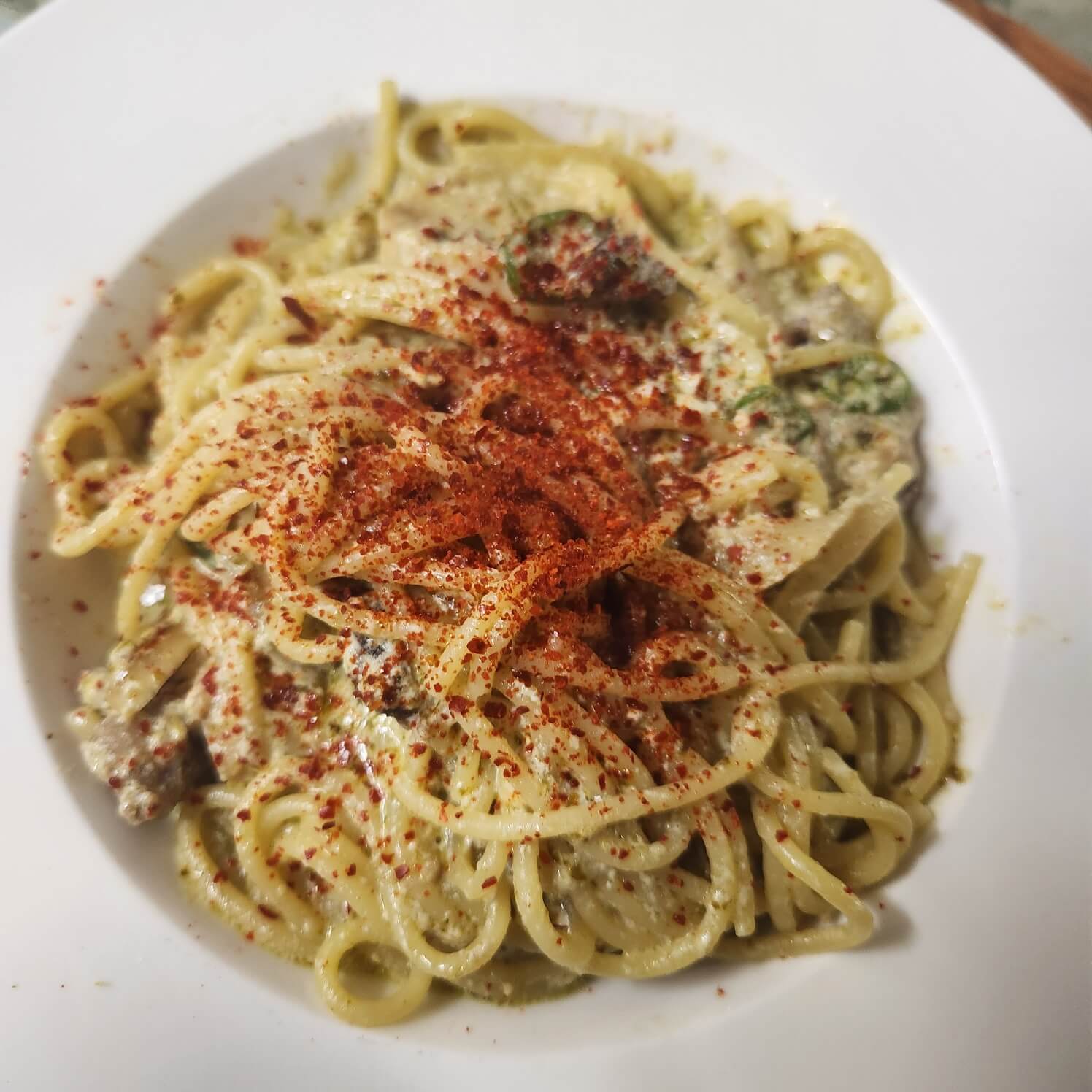 7. 소고기 바질 크림 파스타가 완성 됐다. 취향 것 그냥 부드럽게 드셔도 좋지만 고춧가루를 추가해서 넣어서 먹으면 칼칼하고 맛있는 파스타를 먹을 수 있다.