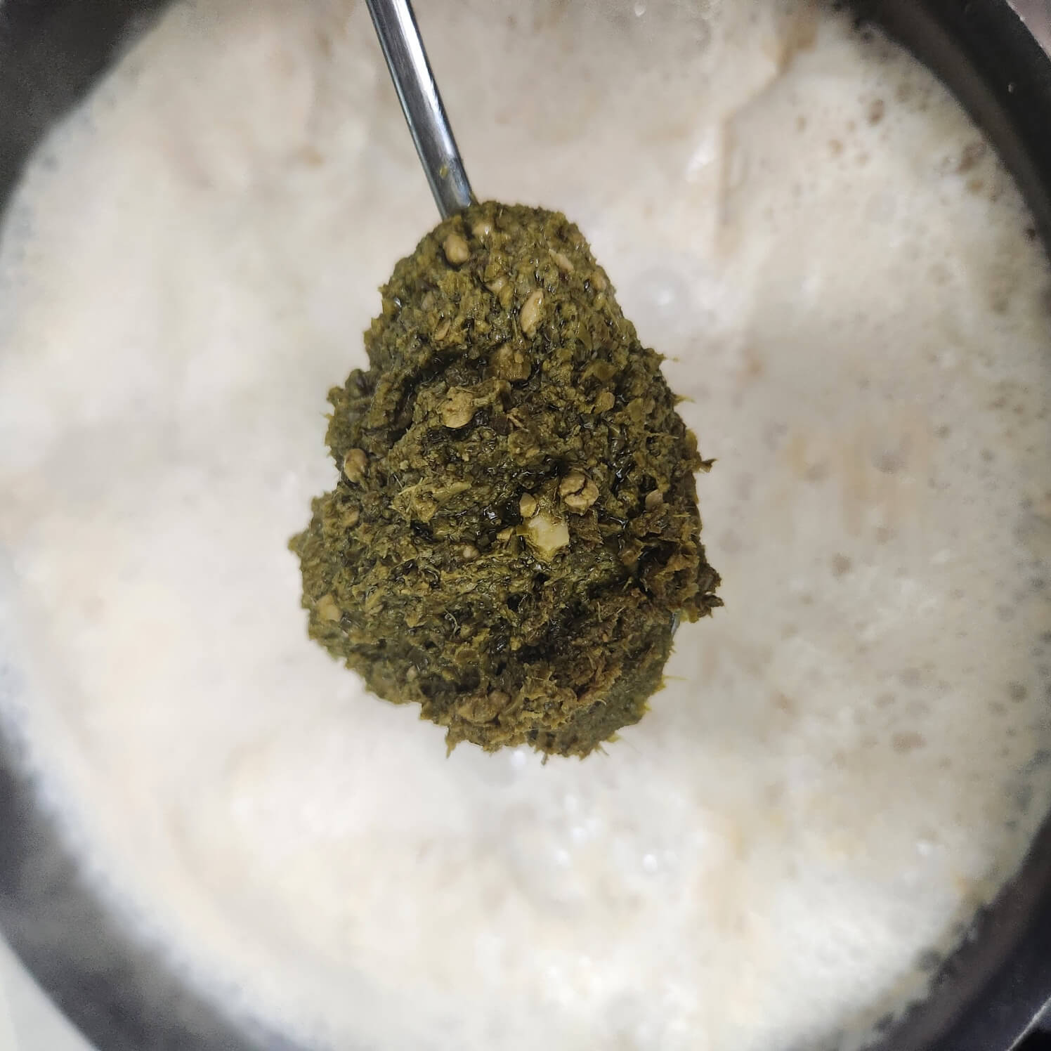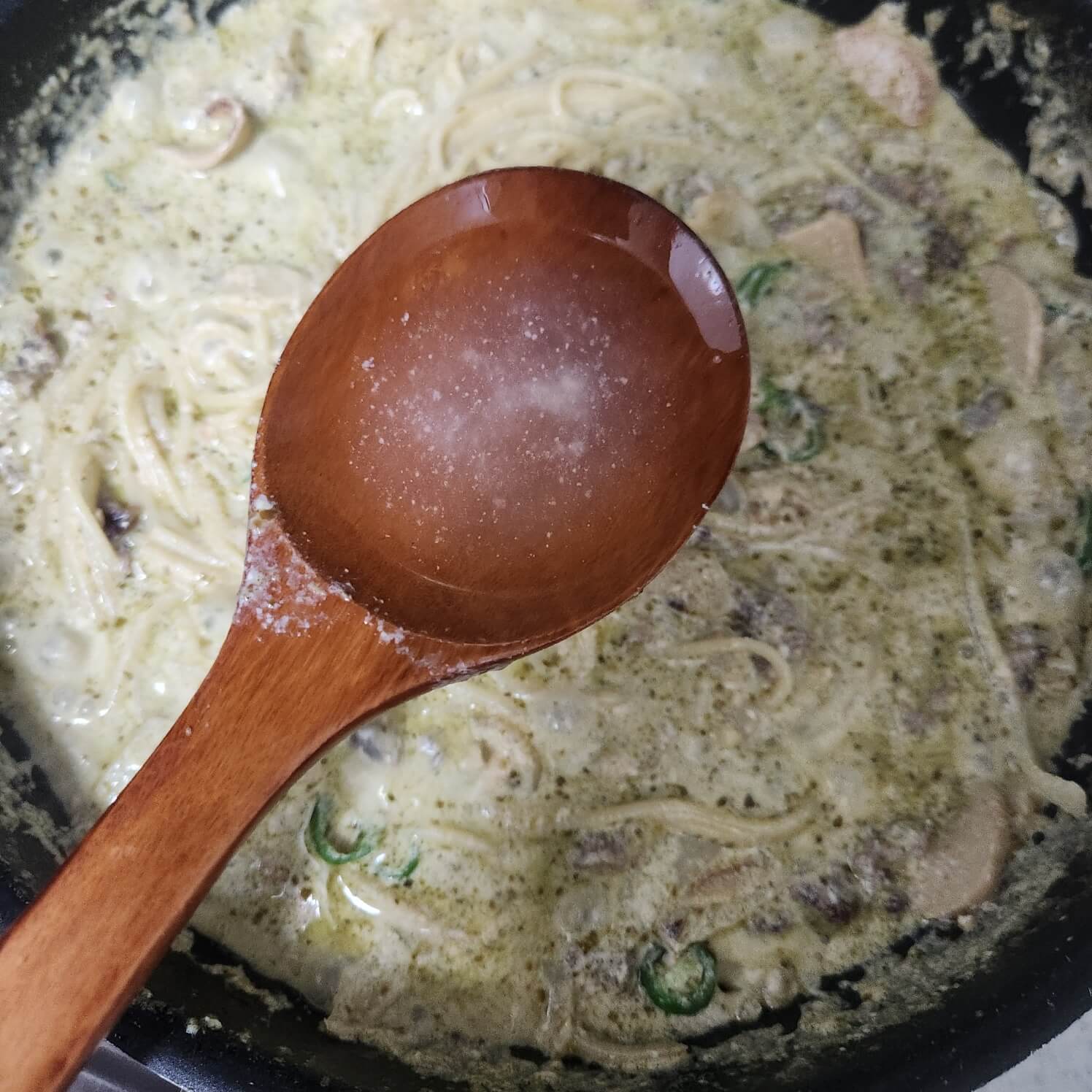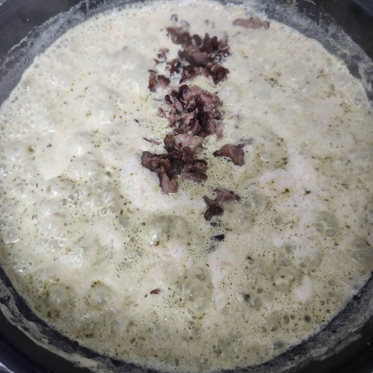 5. 크림 소스가 끓기 시작하면 숟가락 기준으로 바질페스토 1을 넣고, 다진 소고기를 넣고 끓여주면 된다.