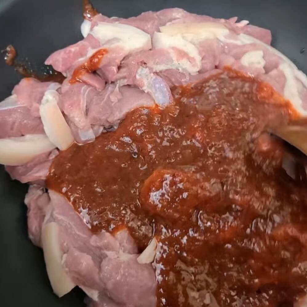 3. 이제 소주와 후추에 재운 돼지고기를 채반에 바쳐서 소주를 빼준 다음에 만든 양념장, 채썬 양파를 넣고 센불 5분, 중간불 5분으로 끓여주고 뚜껑 닫고 약불로 10분 마무리로 끓여주면 된다.