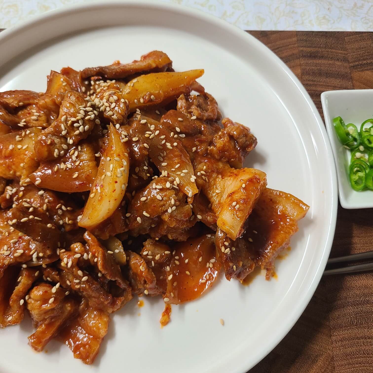 - 돼지고기 2근, 다진마늘, 생강가루, 소주, 간장, 고추장, 고춧가루, 후추, 양파 1개, 맛술