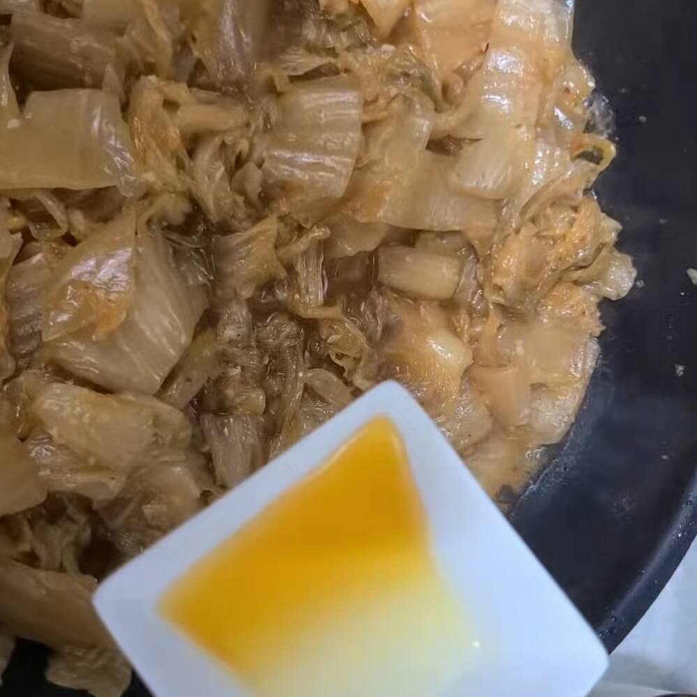 5. 자작하게 끓었던 묵은지 볶음의 수분이 어느 정도 날아가면 숟가락 기준으로 들기름 1, 참치액 1을 넣고 마무리로 센불로 빠르게 볶아주면 맛있는 밥반찬이 완성이 된다.