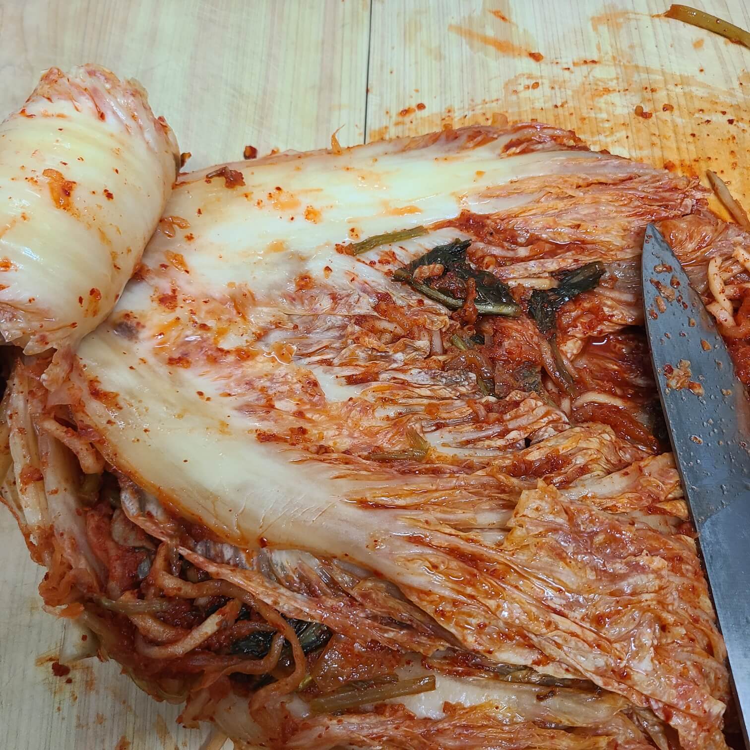 1. 묵은지 안에 있는 양념 속을 모두 칼로 긁어서 빼주면 된다.