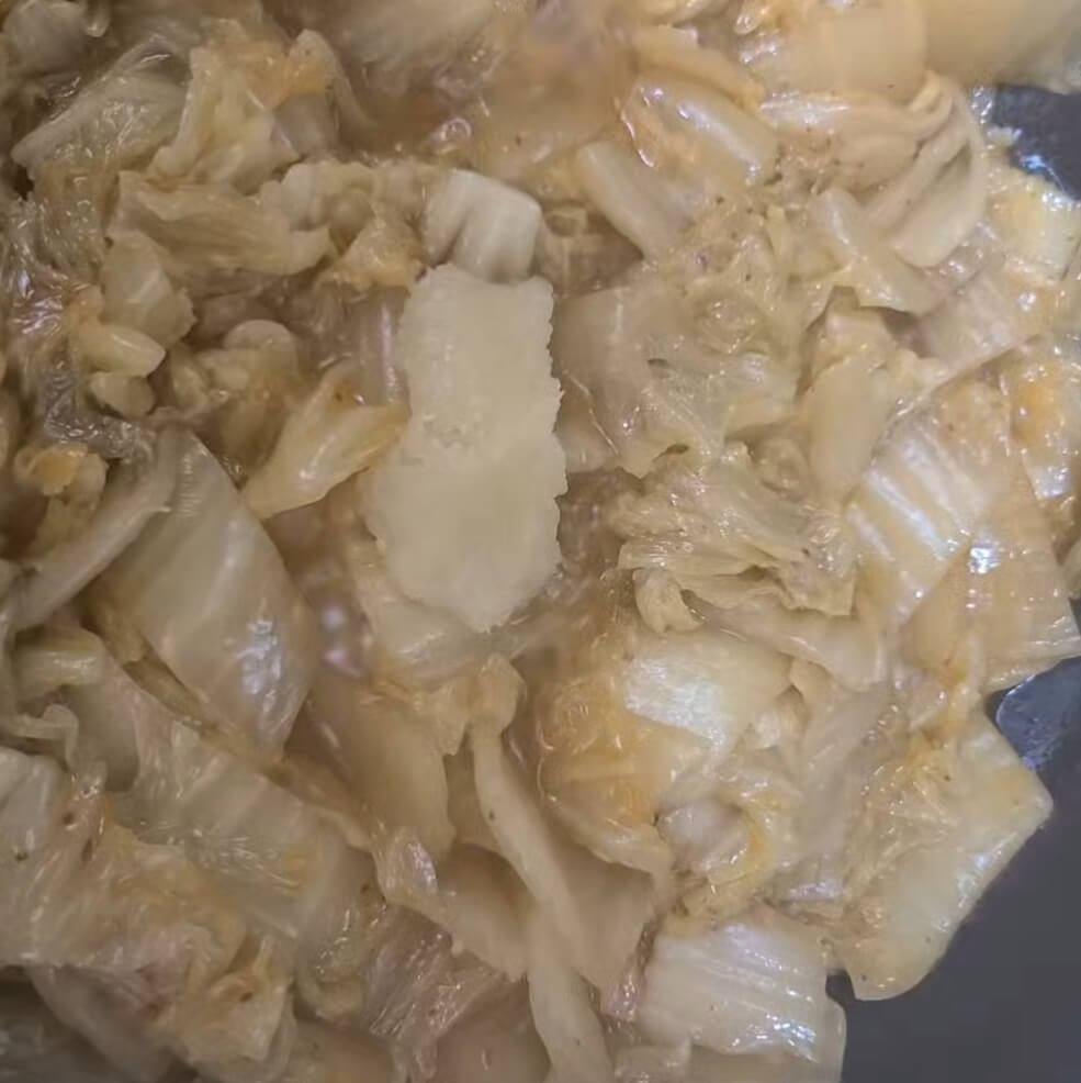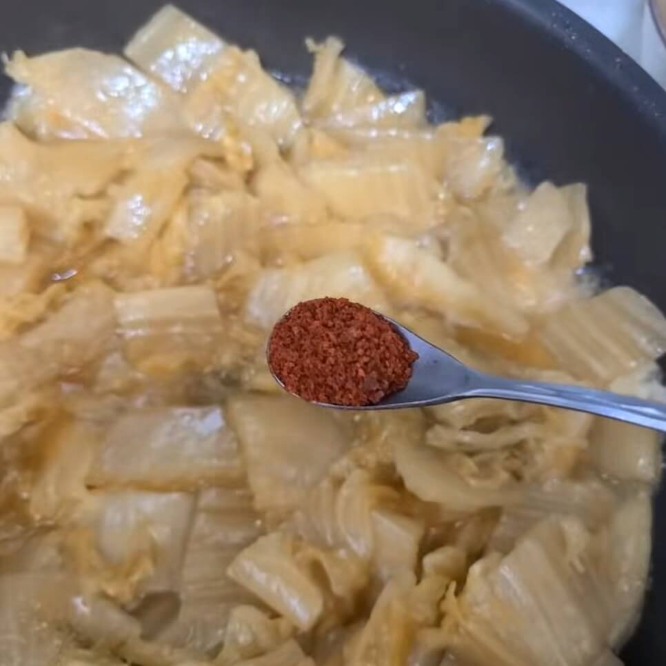 4. 묵은지 볶음이 끓기 시작하면 숟가락 기준으로 다진마늘 1, 티스푼 기준으로 고춧가루 1, 멸치다시마육수 300ml를 붓고 계속 중간불로 끓여 주면 도니다.