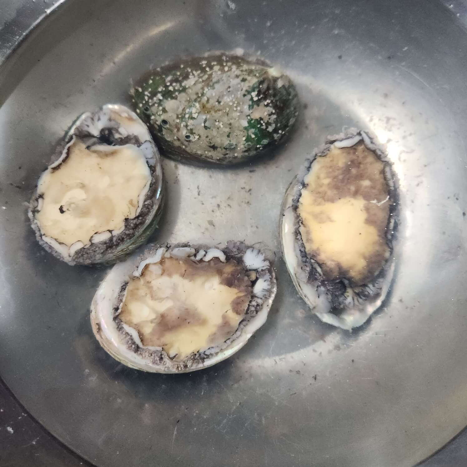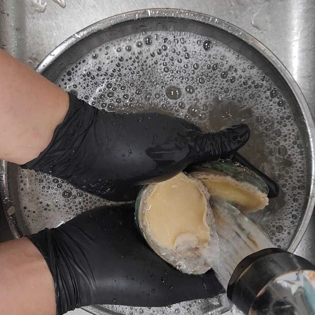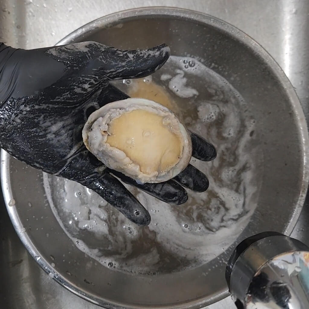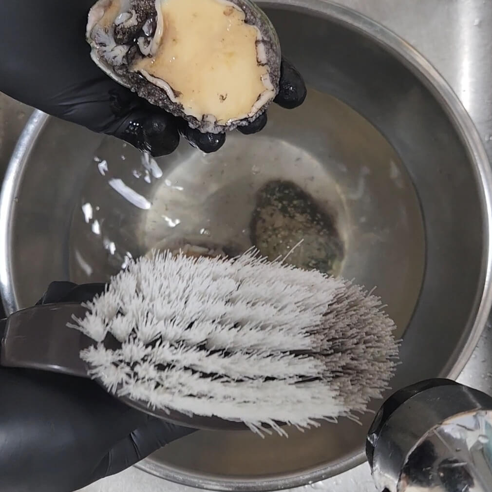 ✅전복에 붙어 있는 검정색 이물질을 모두 솔로 빡빡 닦아서 뽀양게 만들어 줘야 된다.