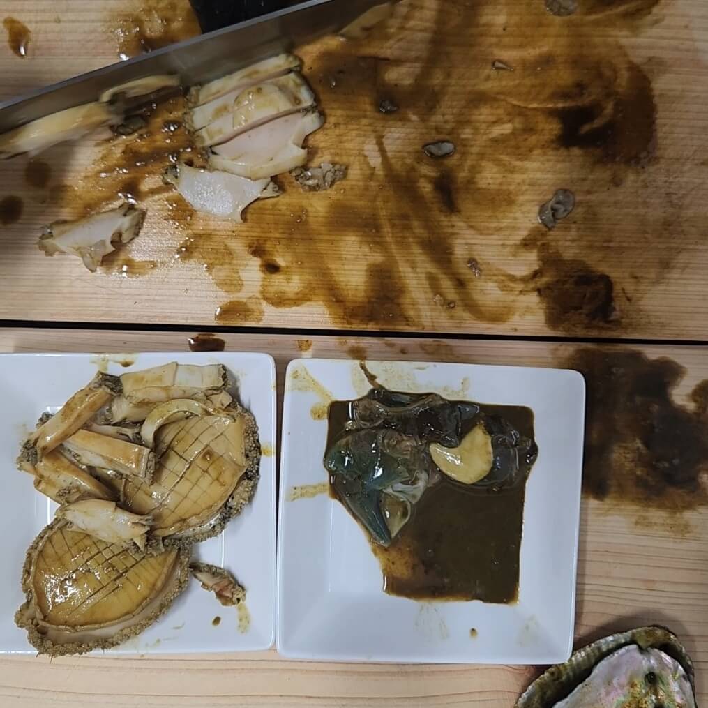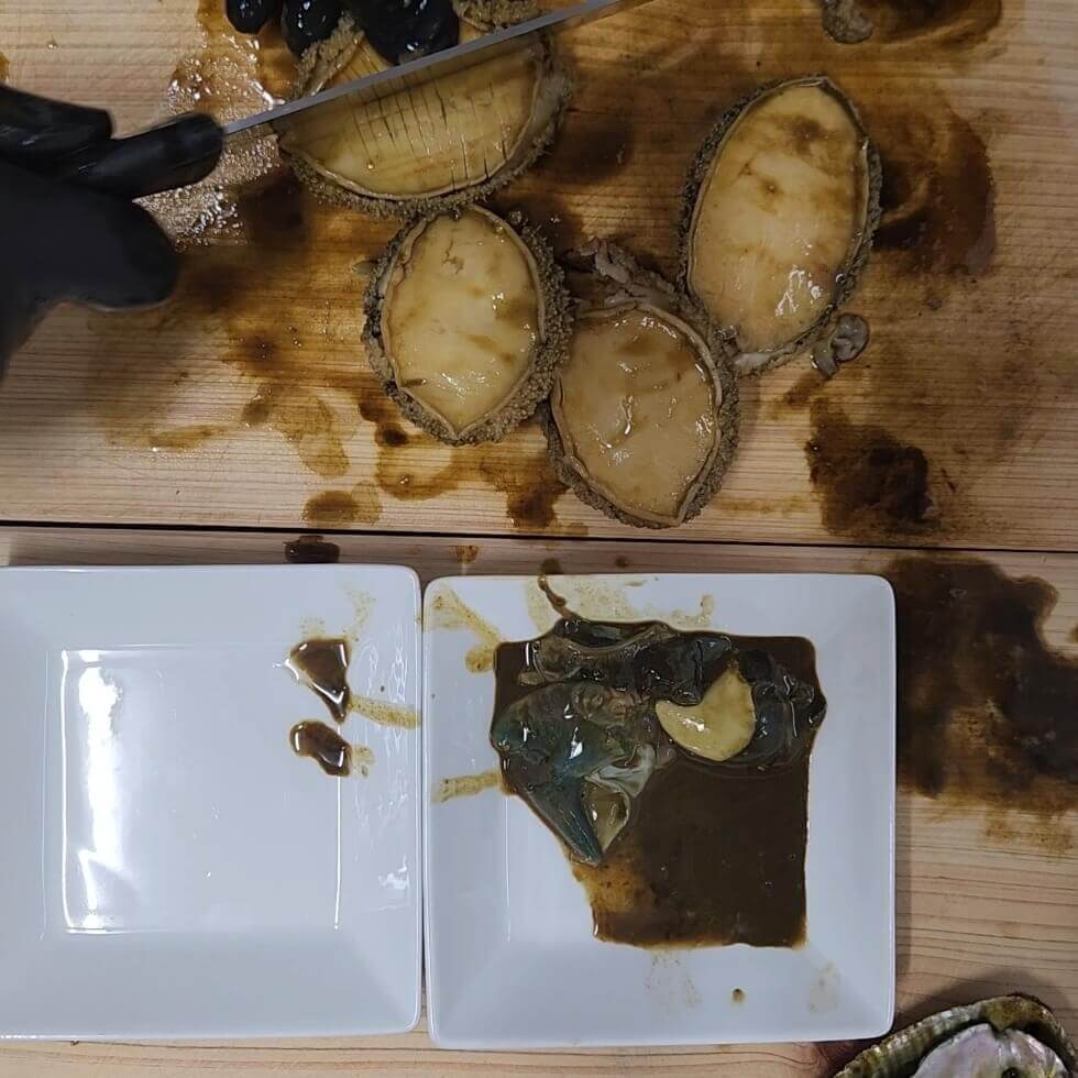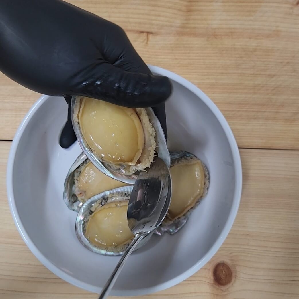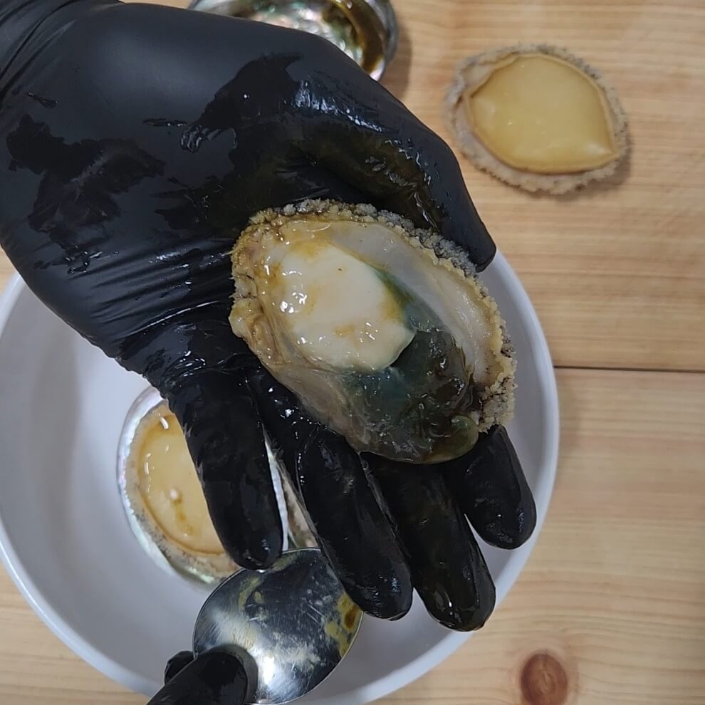 4. 위 사진을 보면 전복 내장과 전복을 분리시켜주는 과정이다.