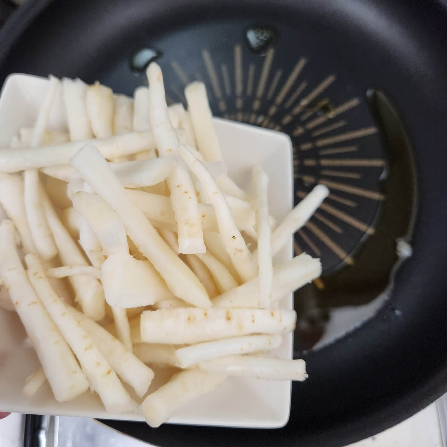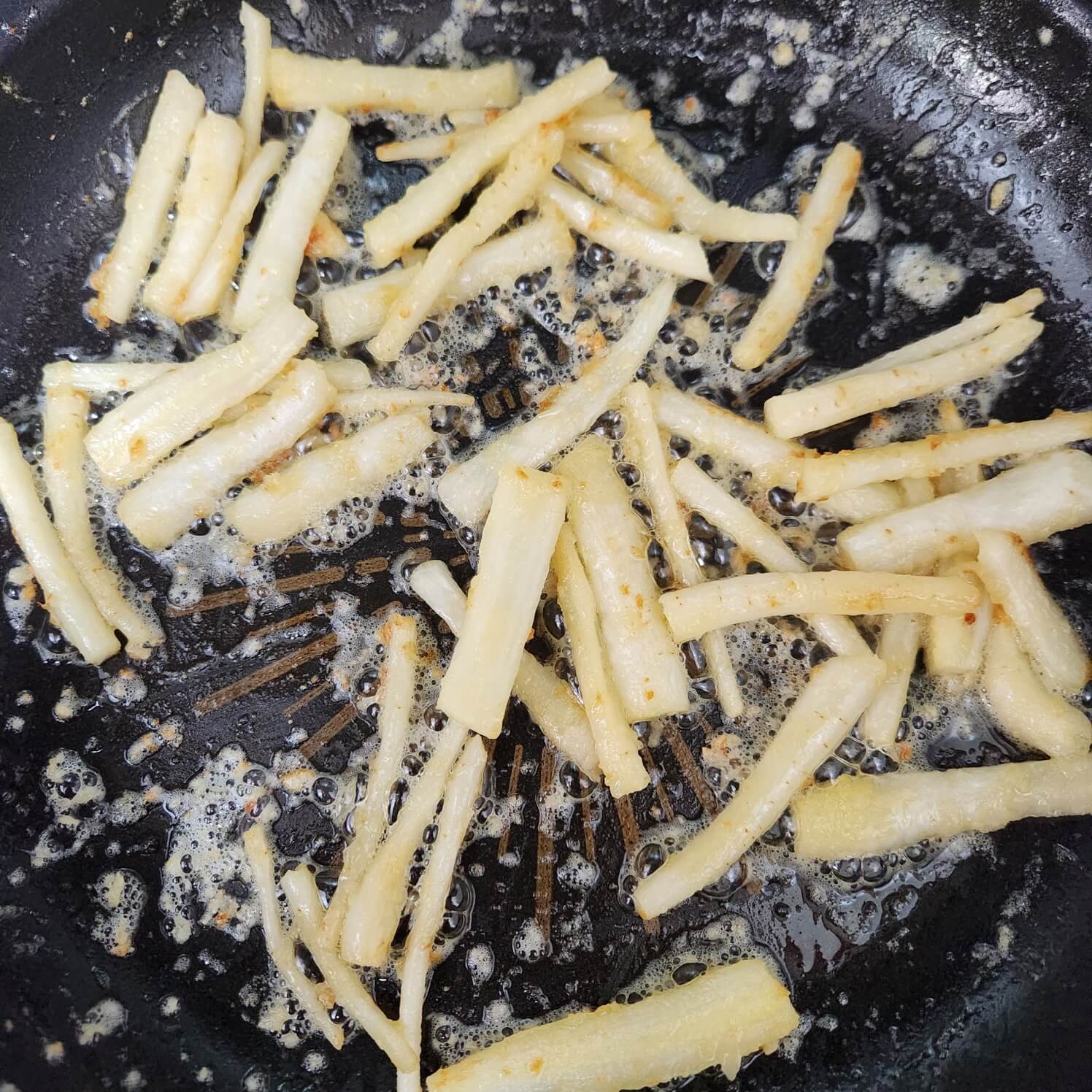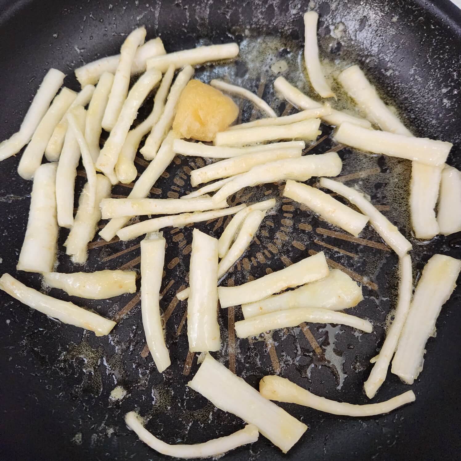 2. 약불로 도라지는 약 3분간 볶아주면 되는데 도라지 겉 표면이 갈색으로 은은하게 익으면 불을 꺼주면 된다.