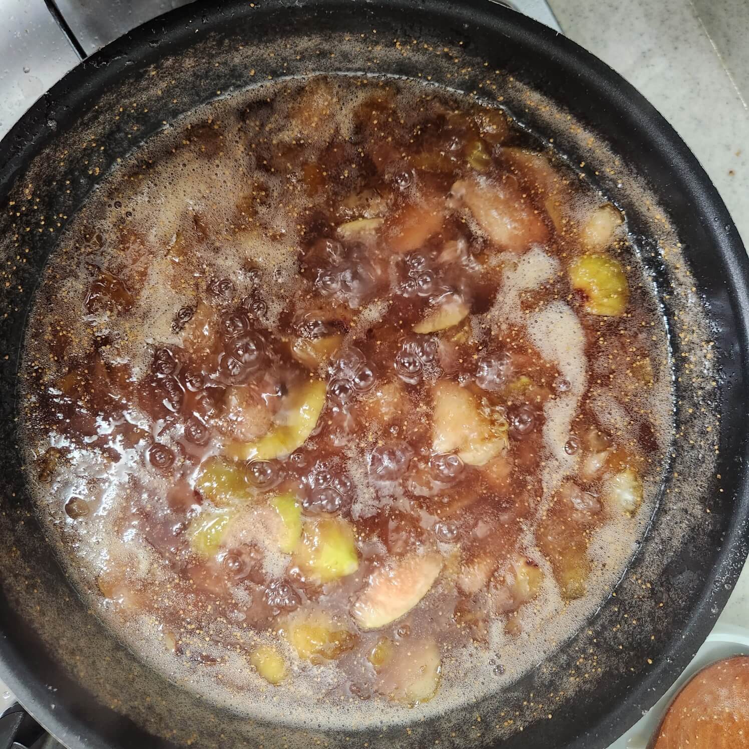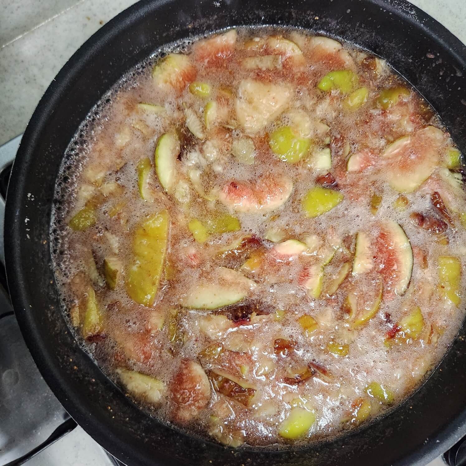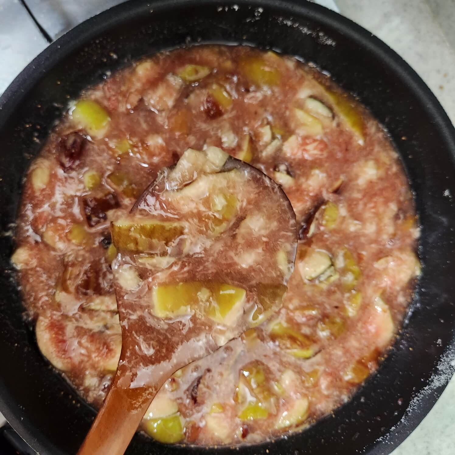 2. 무화과잼 만들기 위해서는 팬에 무화과를 넣고 종이컵 기준으로 설탕 4.5 잔을 넣고 끓을 때 까지 저어주면서 중간불로 끓여주면 된다.