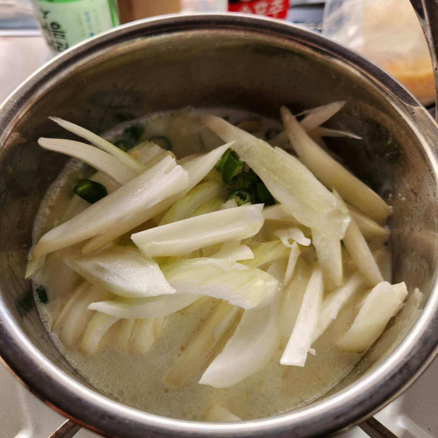 2. 종이컵 기준으로 우유 2.5잔, 생크림 1.5잔을 넣고, 채썬 양파와 송송 썰은 청양고추를 넣어주고 끓으면 체다치즈와 파마산치즈가루 2 숟가락을 넣고 5분 ~ 10분간 끓여주면 된다.