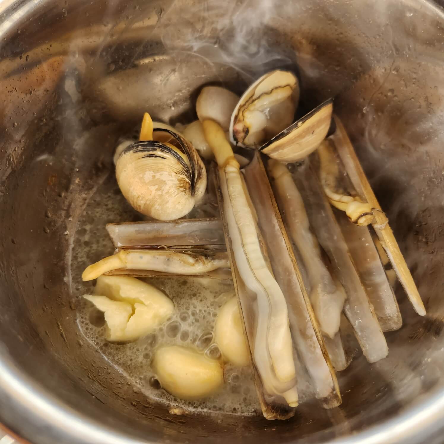 ✅숟가락 기준으로 기름 3 ~ 5를 넣고, 빻은 통마늘과 함께 조개류를 약불에서 5분동안 익혀주면 된다.
