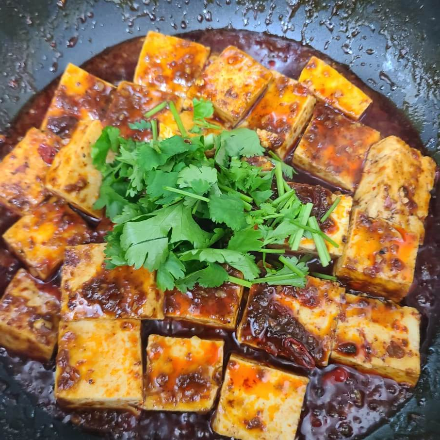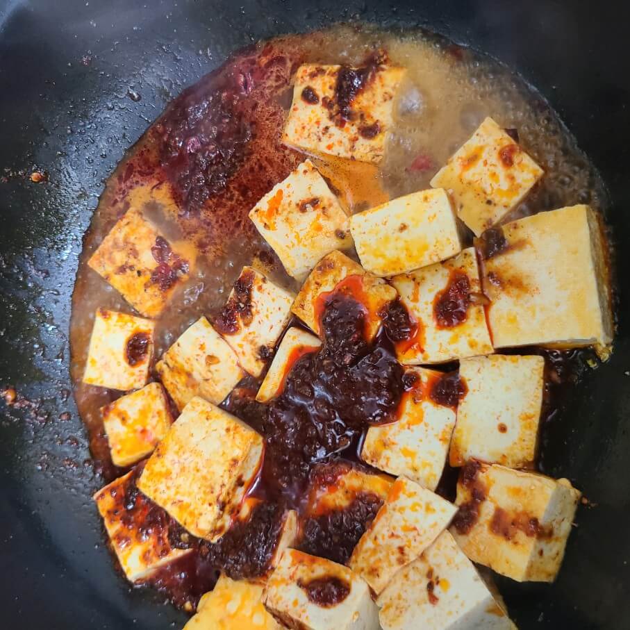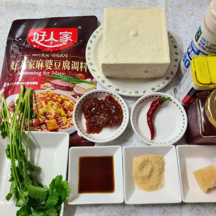 - 마파두부 소스, 두부 1모, 구운소금, 후추, 두반장, 홍고추, 고추기름, 고수, 간장, 설탕, 다진마늘