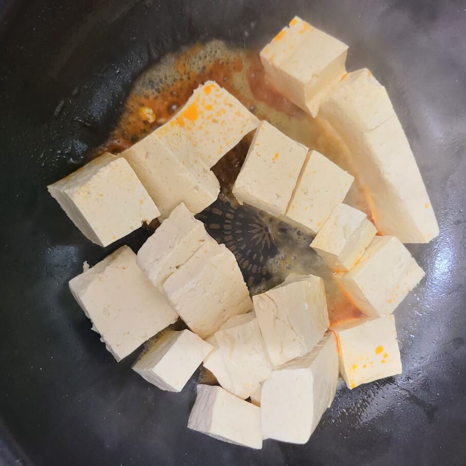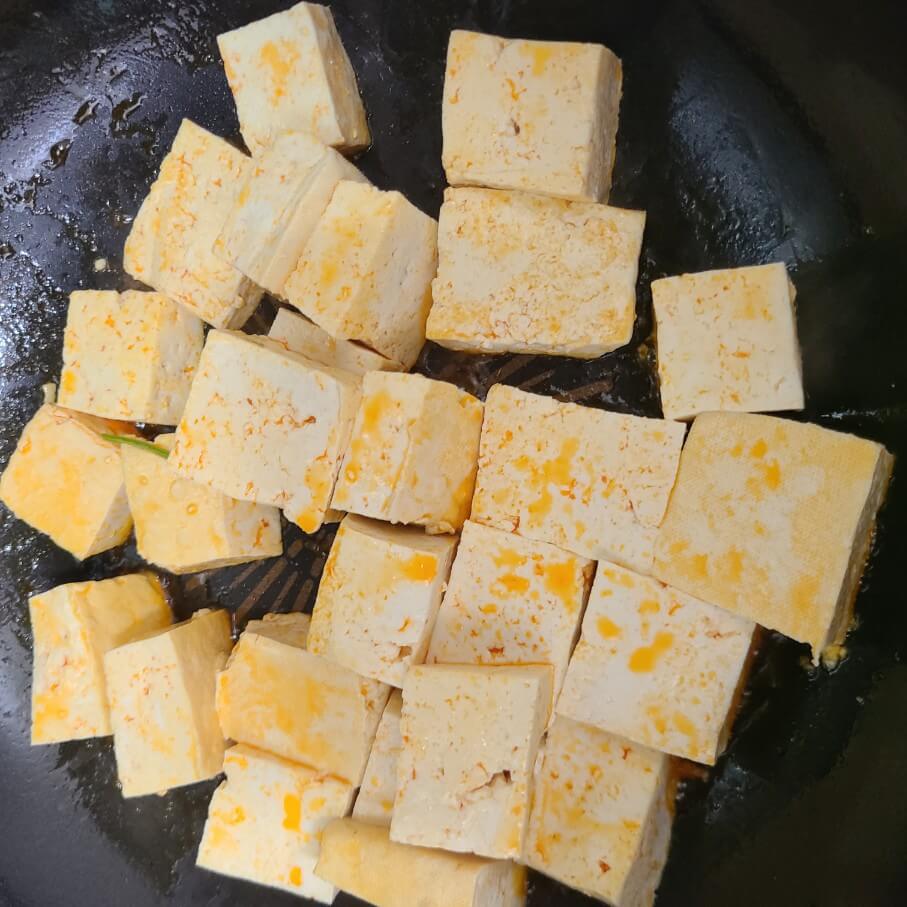 3. 숟가락 기준으로 고추기름 2을 넣고 데친 두부를 노릇하게 부쳐주면 된다.