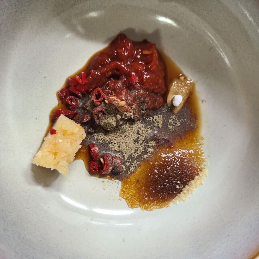 - 숟가락 기준으로 간장 1, 설탕 1, 두반장 1, 간장 1, 고추기름 2