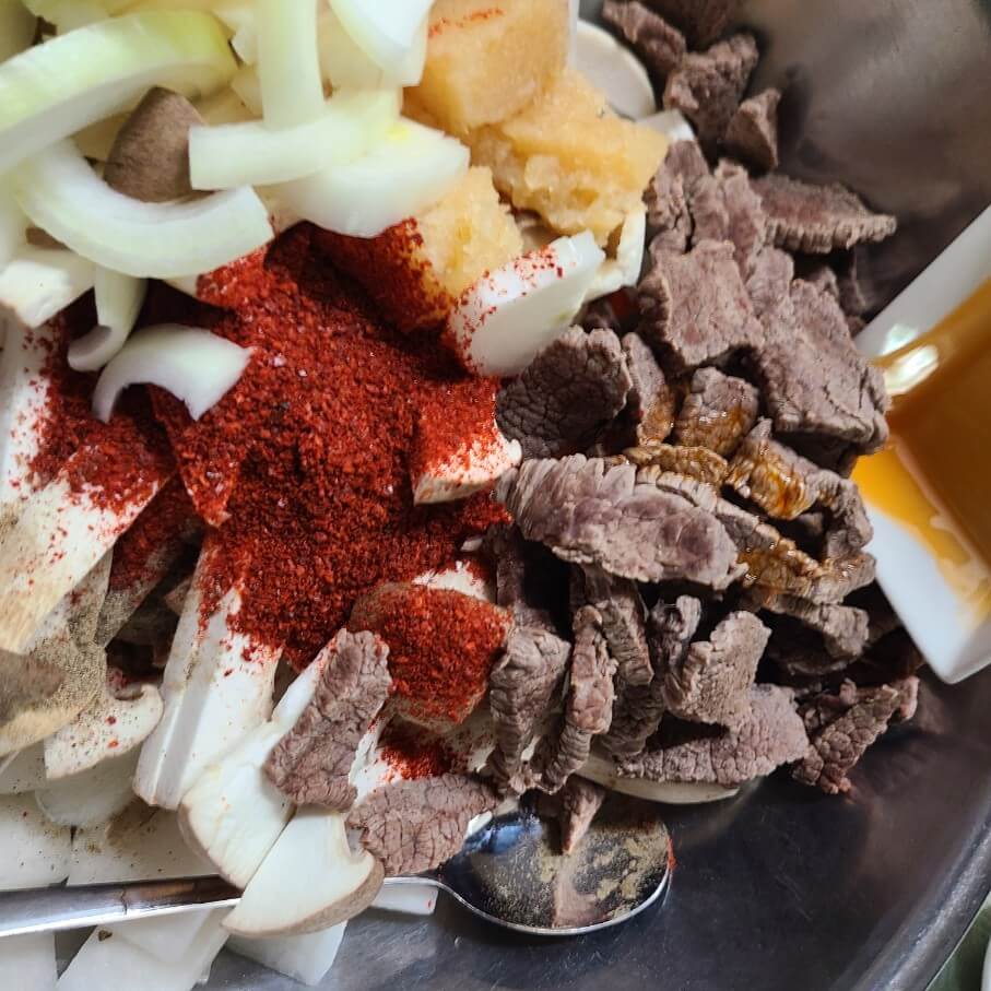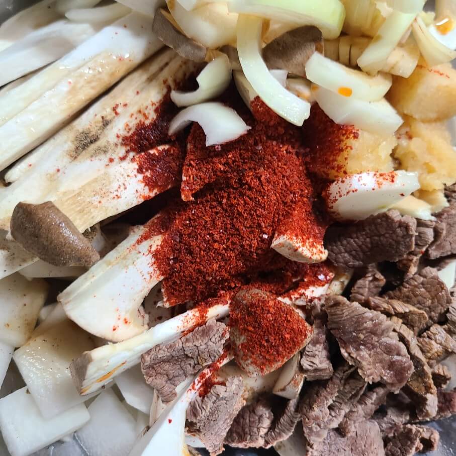 - 소고기양지 , 무, 양파 반개, 청양고추 1개, 홍고추 1개, 쪽파 조금, 새송이버섯 3개, 고추기름, 꽃소금, 다진마늘, 고춧가루, 국간장, 참치액젓, 후추