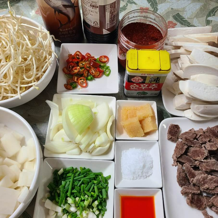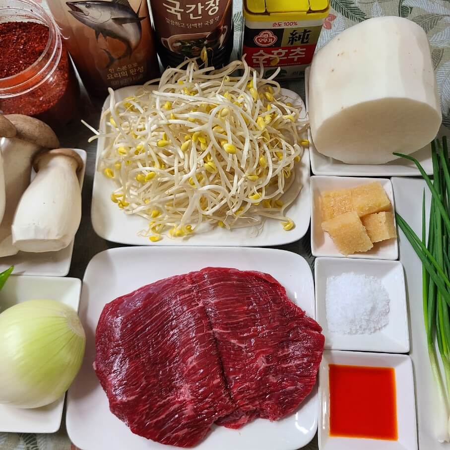 - 소고기 460g, 무 500g, 새송이버섯 330g, 다진마늘 40g