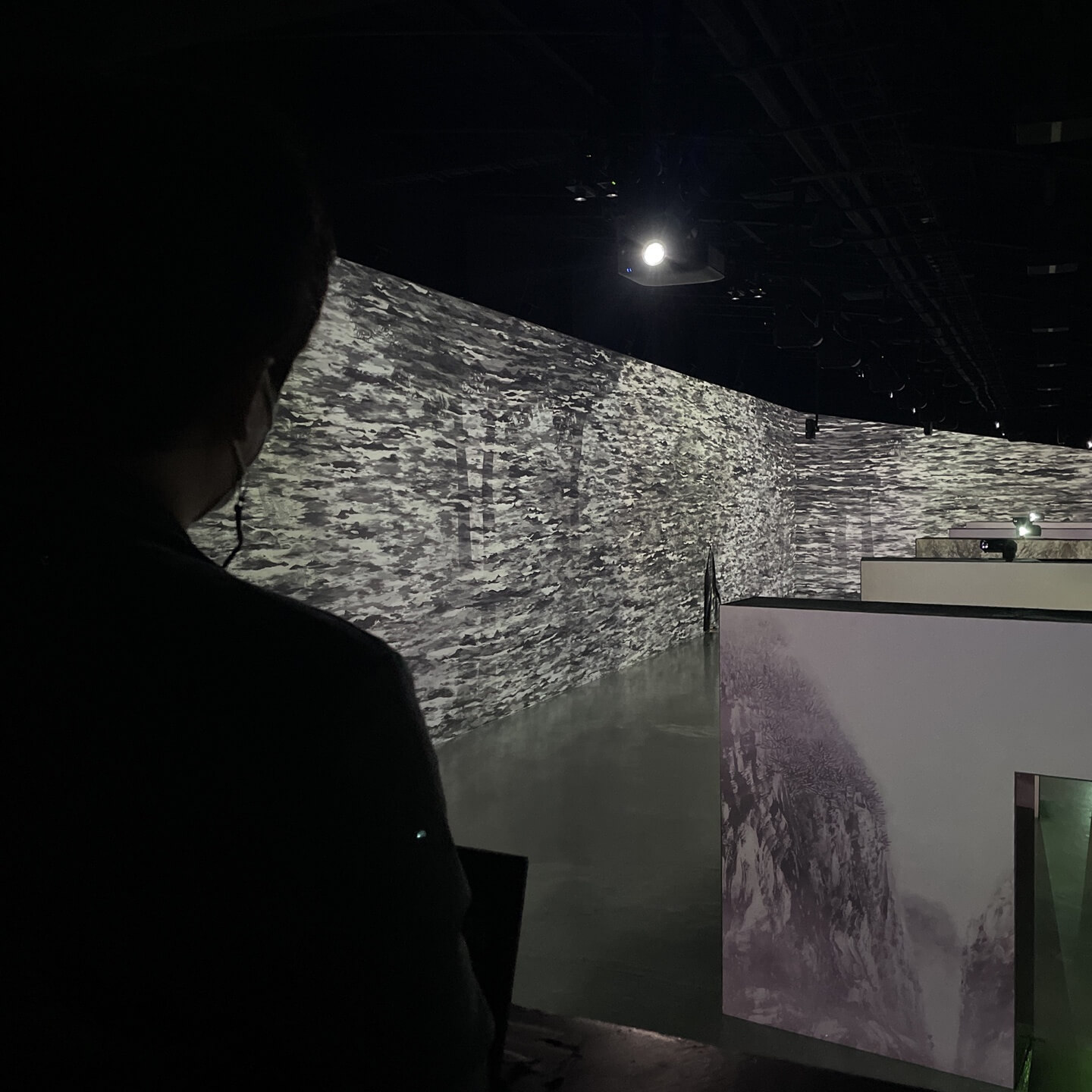 아르떼 뮤지엄을 돌아다니다 보면 엄청 큰 전시장에 위에서 볼 수 있는 공간이 있습니다. 어두워서 설명은 잘 못하겠지만 동백꽃을 지난 다음, 아니면 파도를 지난 다음에 있는 곳 중에 있으니 감상하시면 찾는게 좋을 것 같습니다. 이 공간은 총 5개의 창문이 있는데 여기서 내려다 보는 전시 작품 또한 너무 좋은 장소 중에 하나입니다. 제가 있는 곳은 5개의 작품이 전시를 하면서 노래가 바뀌는 곳입니다. (저는 2층 높이에서 전시 작품을 구경했는데 너무 좋았습니다.) 이번 작품은 "시간을 담은 빛, 방의걸"이라고 합니다. 모든 색을 품은 검은 먹빛 공간에서 시간이 만든 아름다운 자연 속에 머물며 저마다 심상으로 확장된 공간을 경험할 수 있습니다. 목정 방의걸 화백은 70년 가까이 먹을 탐구한 수목 화가라고 합니다. 객관적인 시각으로 자연을 그리는 것이 아닌, 구상과 추상의 경계를 허문 자유로운 상상력으로 마음속 깊은 심상에서 우러나오는 자연을 표현해서 전시됐다고 합니다. 그냥 볼 수밖에 없는 것 같습니다. 미술 작품의 화려함에 감춰져서 그저 바라만 보는 게 너무 좋았던 것 같습니다. 서서 전시를 구경하시는 게 힘드신 분들은 아래에 내려가셔서 앉아서 구경하시면 작품을 감상하시는 것도 좋은 시간이 보낼 것 같습니다. 저는 작은 네모 전시관 벽에 붙어 앉아서 작품을 구경한 것 같습니다. 5가지의 작품을 보면서 심오하지만 작은 힐링을 했던 곳 중에 하나였습니다. 혼자 자유롭게 미술 작품을 볼 수 있는 공간이 가장 좋았던 이유였던 것 같습니다. 우리가 아는 미술관은 돌아다니면서 작품을 감사하면서 격식이 필요한 곳인데, 아르떼 뮤지엄은 미술작품을 자유롭게 감사할 수 있는 게 또 색다른 매력인 것 같습니다.