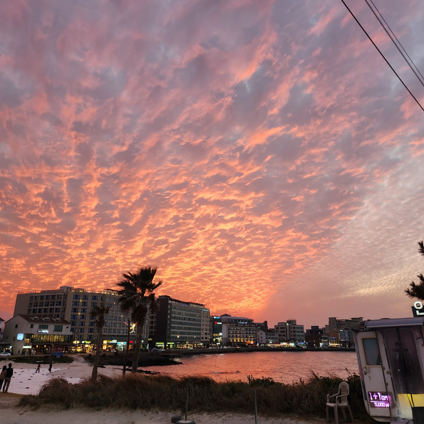 노을이 집어삼킬 것처럼 붉게 물든 제주 하늘입니다. 하늘과 바다가 붉게 물든 것을 보니 너무 이뻐서 사진을 찍었던 장소입니다. 김녕해수욕장은 아니지만 함덕 해수욕장 인근에서 찍었던 것 같습니다. 해안도로 드라이브를 하다 보면 다양한 풍경들이 스쳐 지나갑니다. 파도치는 사람, 자전거 여행하는 사람, 혼자 걸어 다니면서 즐기는 사람들이 있습니다. 그리고 지금 신도시에는 없고 구도시에만 있는 전봇대와 전선들이 넓게 이어져 있는 것 또한 제주 하늘과 센티하게 바뀌면서 이색적이게 아름다웠습니다. 제주의 하늘과 바다는 보는 재미와 행복을 주는 것 같습니다.