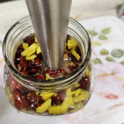 4. 다 손질은 대추, 생강, 꿀을 넣고 보관할 유리병에 넣어서 한 번에 "핸드 믹서기"로 갉아줬습니다.