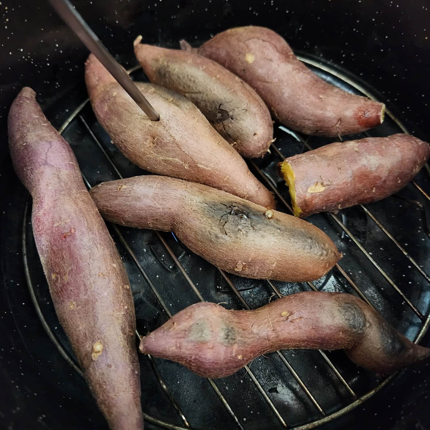 👉대략 20분 ~ 30분 정도 구워주시면 군고구마가 익어요. 젓가락을 넣어서 쑥 들어가면 완전히 익은 거에요.