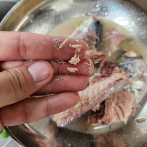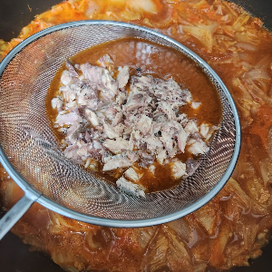 고등어 통조림에 있는 고등어는 숙성이 되어 있는 상태라 큰 가시, 작은 가시 모두 으스러집니다. 기름을 잘 짜고 냄비에 숟가락으로 잘 으깨가면서 넣어주시면 돼요.