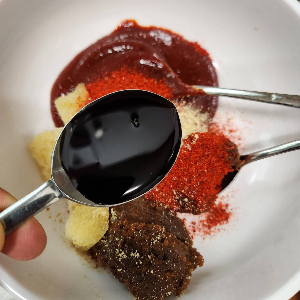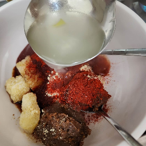 숟가락 기준으로 된장 2, 고추장 2, 다진 마늘 2 숟가락, 고춧가루 1, 국간장 3, 생강가루 1 티스푼을 잘 섞어주시면 되는데 고추장이랑 된장이 잘 안 섞여요.