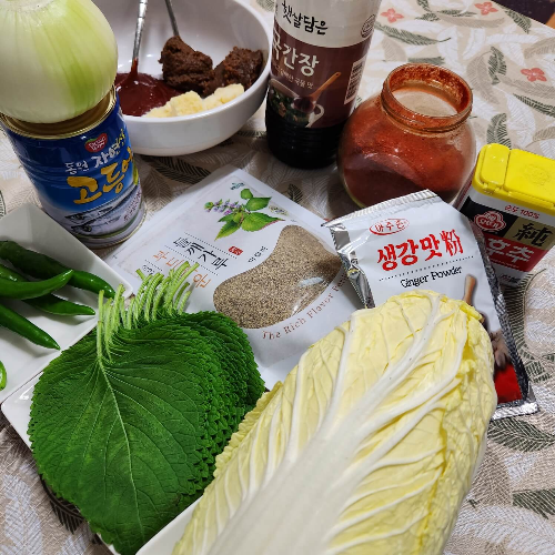 재료: 알배추 1 포기, 깻잎 1 봉지, 양파 1개, 청양고추 5개, 고등어 통조림 1캔