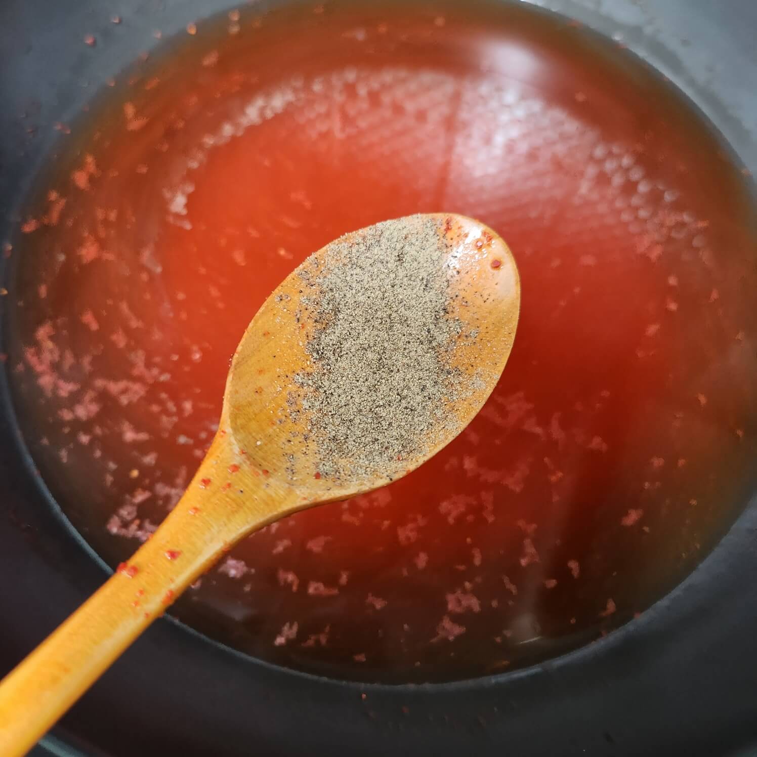 - 숟가락 기준으로 고춧가루 2, 간장 2, 소금 0.5, 후추 취향 것 (20번), 국수장국 가쓰오부시 2숟가락