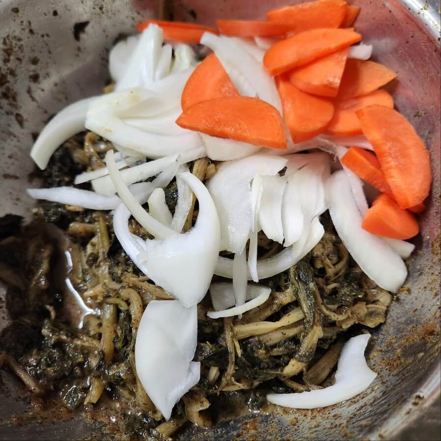 - 시래기 335g, 양파 반개, 마늘 1 숟가락 16g, 당근
