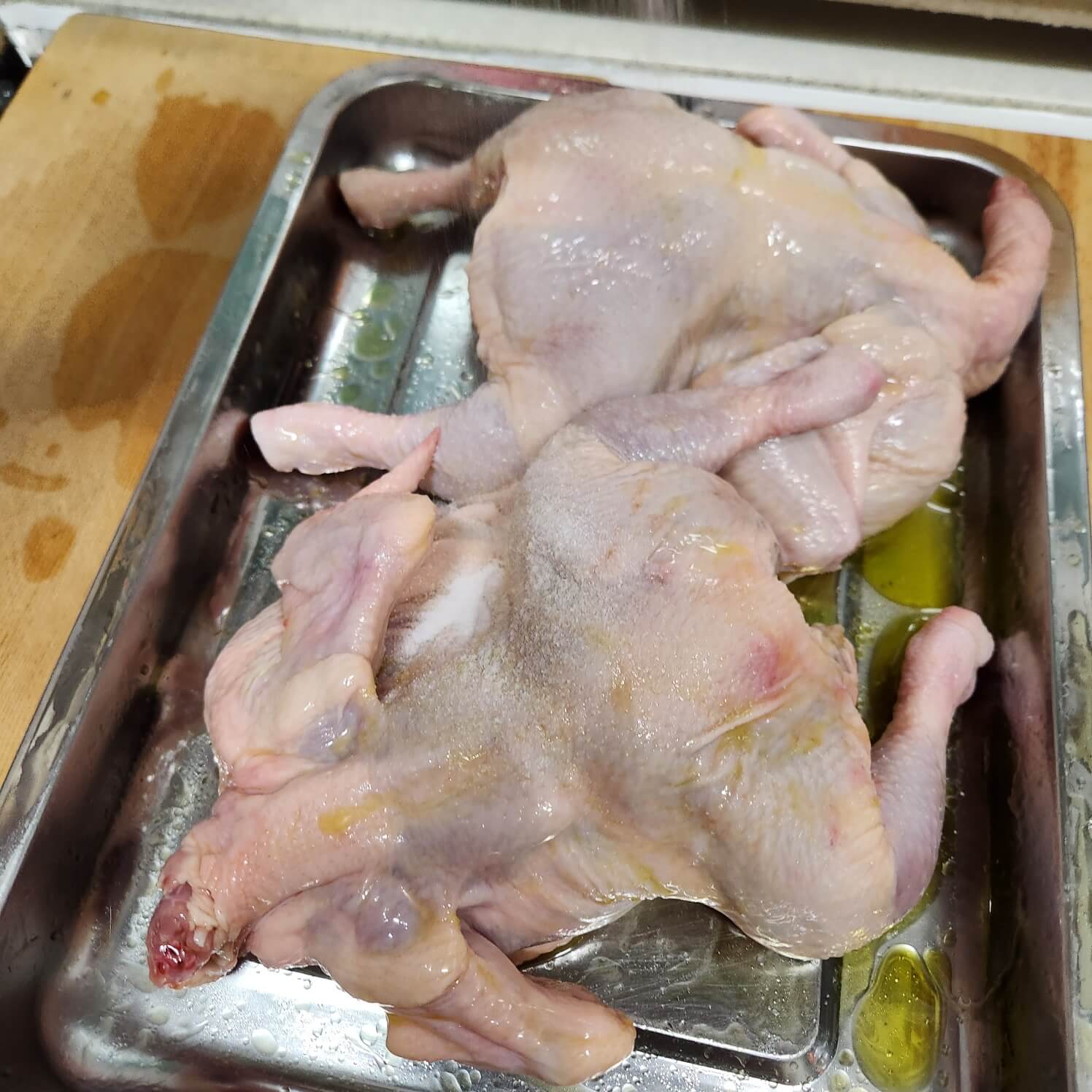 2. 수비드를 하기위에서 닭을 반으로 갈라서 벌려주시면 돼요.