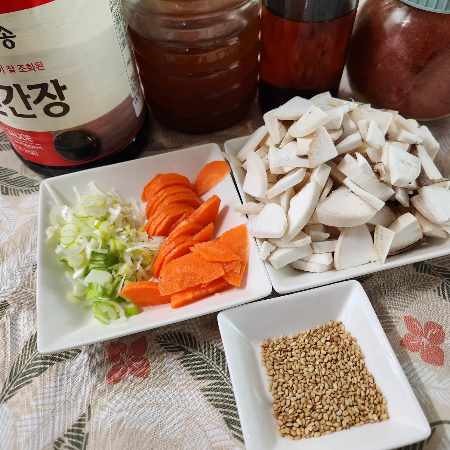 • 콩나물 1팩, 불린 쌀, 들기름, 참기름, 대파반쪽, 당근, 새송이 버섯 2개, 깨, 고춧가루