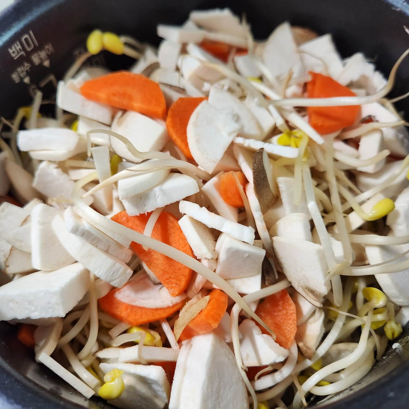 4. 쌀 위에 콩나물, 새송이버섯, 당근, 콩나물을 넣고 전기밥솥 취사를 눌러주면 완성이다.