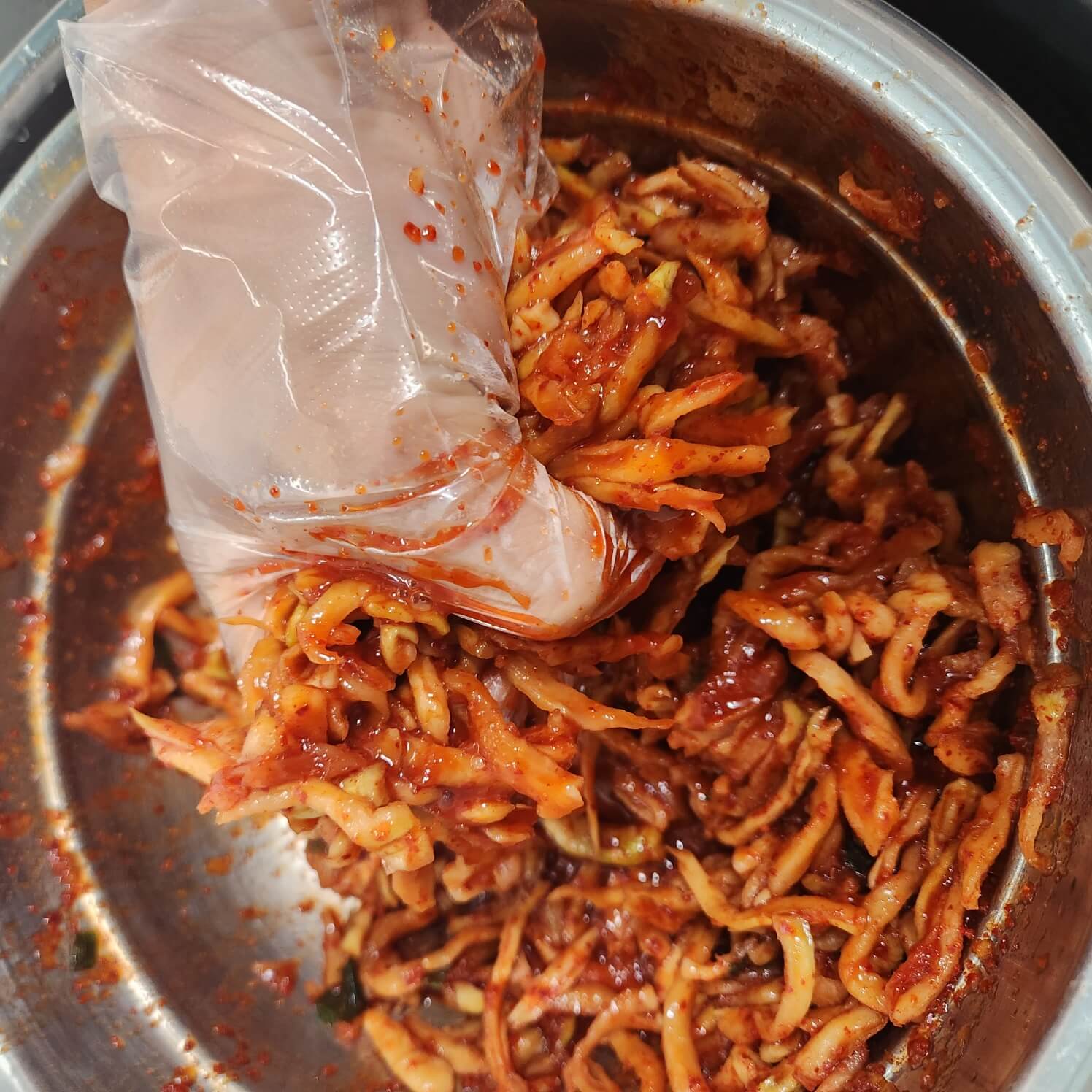7. 무말랭이를 숟가락으로 버무려 주시다가 비닐장갑을 끼고 버무려 주시면 완성입니다.