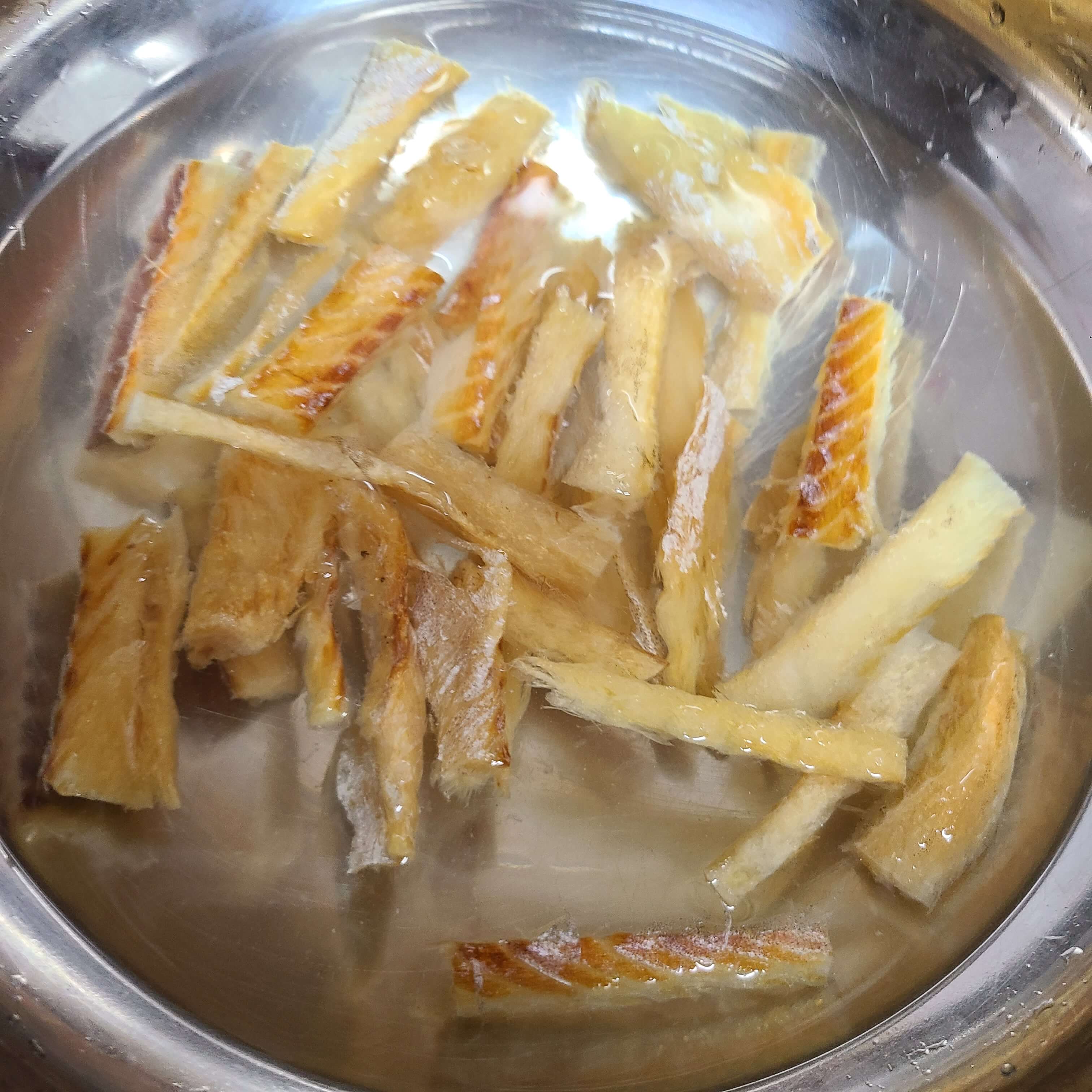 👉물에 5분 정도 담그고 나서 물 먹은 황태를 꼭 짜주면 된다.