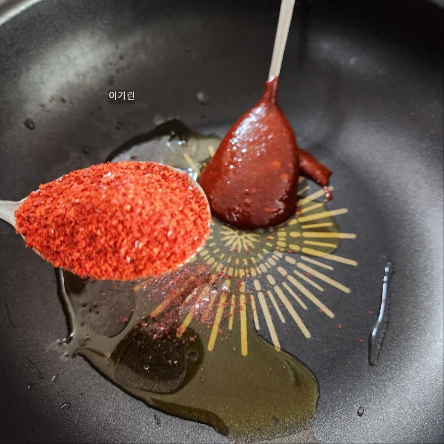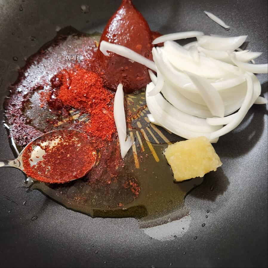 👉숟가락기준으로 고추장 1, 들기름 2, 참치액 2, 고춧가루 1, 물엿 1, 후추 5을 넣고 다진마늘, 양파를 넣고볶아주면 된다.