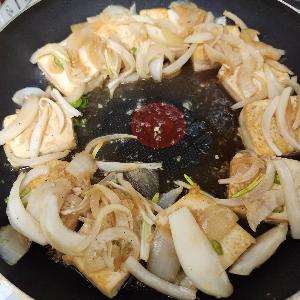 6. 중간에 두부를  중간에 한 번씩 뒤집어 주시면서 간장 소스를 두부, 양파에 뿌려주시면 간이 더욱 잘 배어요.