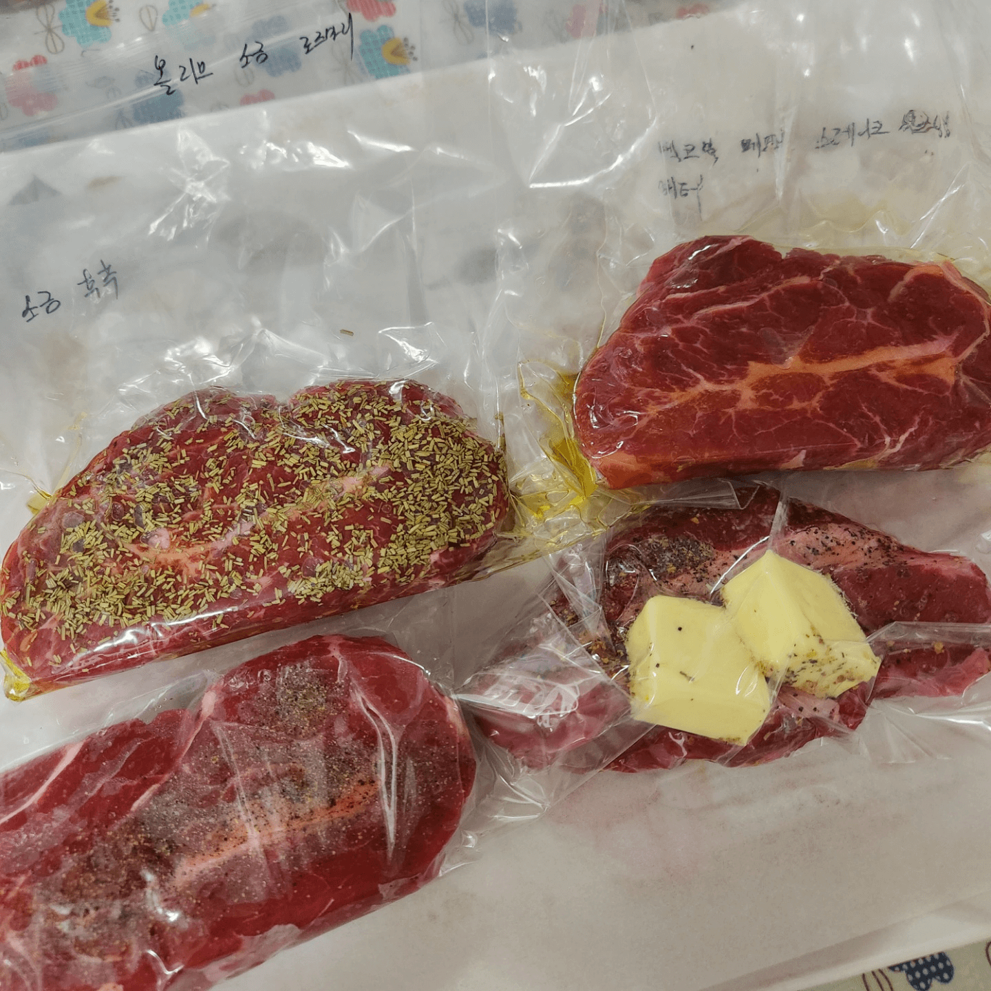 이렇게 각각의 소고기 위에 시즈닝을 해주시면 됩니다. 저는 각각 새로운 맛을 원하기 때문에 따로따로 진공팩으로 했습니다.