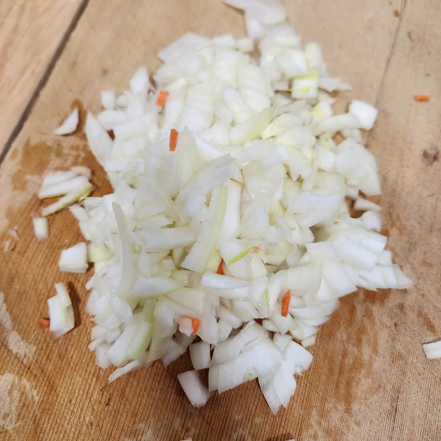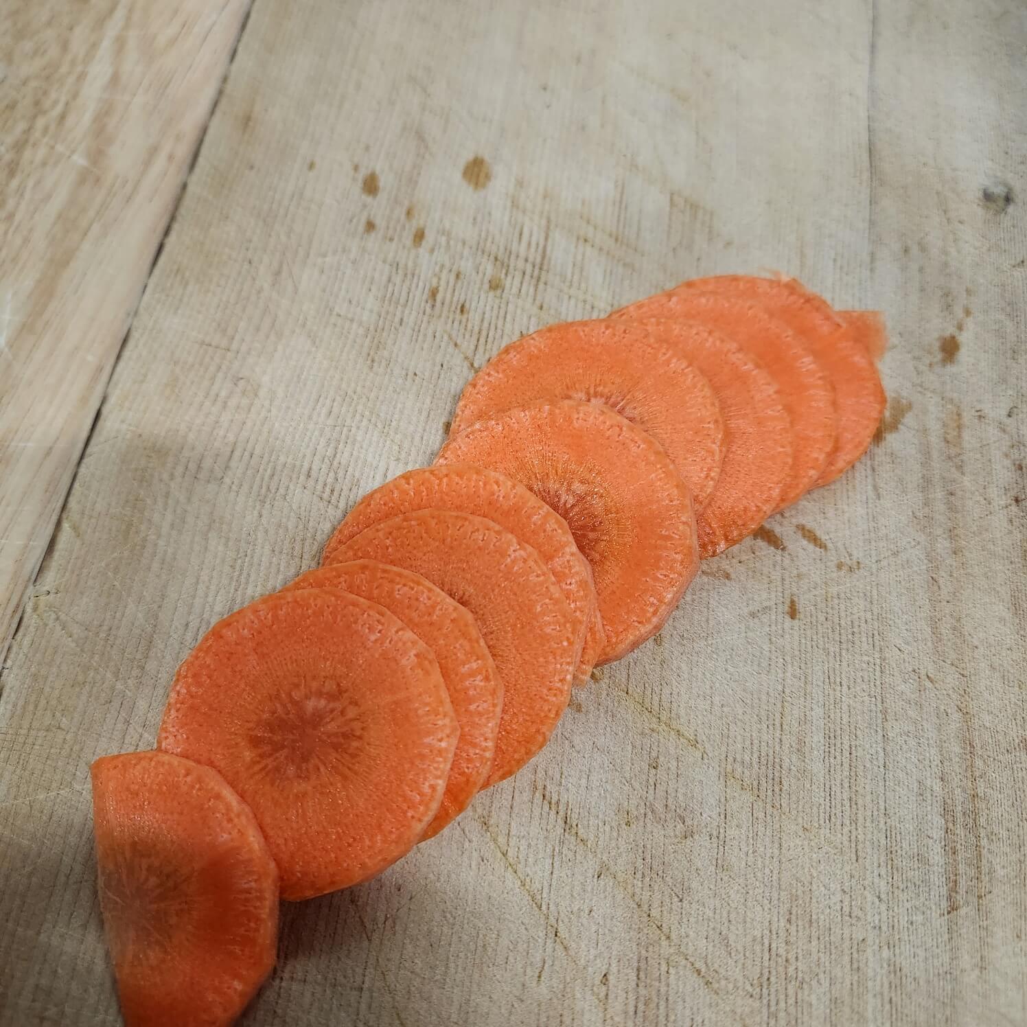 1. 당근은 원으로 잘라서 나란히 놓고 채 썰어주신 다음에 곱게 다져주시면 됩니다.