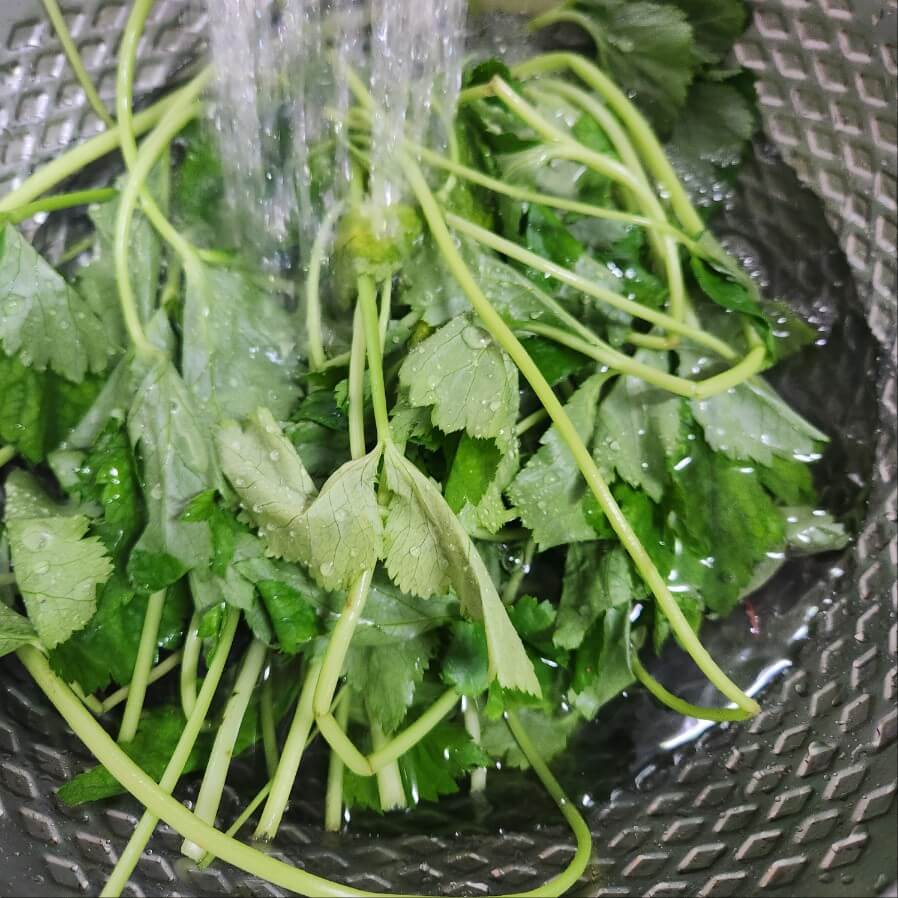 3. 손질 된 참나물은 이물질이 생각보다 많이 나와 물에 2 번 ~ 3번 정도 씻어주면 바닥에 이물질이 나오지 않는다.