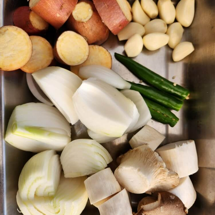 - 닭봉 16개 ( 500g), 닭다리 4개, 통마늘 10개, 호박고구마 2개, 양파 2개, 청양고추 3개, 새송이 버섯 2개