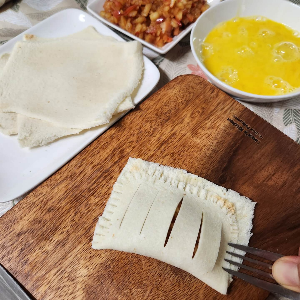 ✔✔그리고 식빵을 접어서 포크로 "꾹꾹" 눌러주시면 1차적으로 완성이 됩니다. 지저분한 빵 끝은 칼로 잘라주시면 된다.